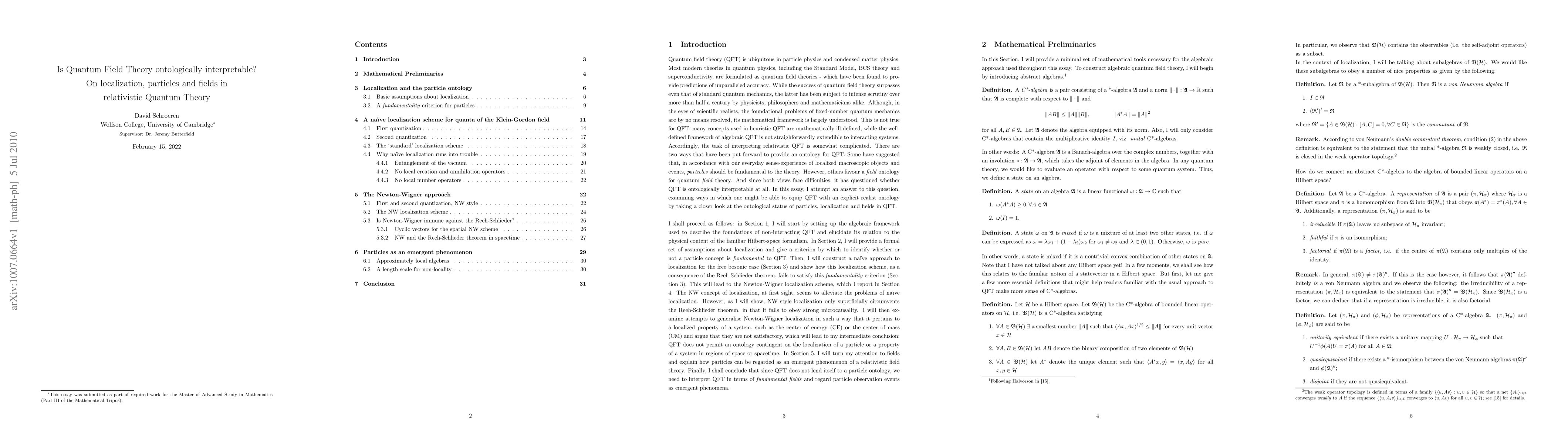 This paper explores the ontological interpretability of quantum field theory by investigating criteria for particle localization and the emergence of particles as phenomena in relativistic quantum field theory. It demonstrates that both naive and Newton-Wigner localization schemes fail to satisfy fundamental criteria, leading to the conclusion that particles are emergent from the field.