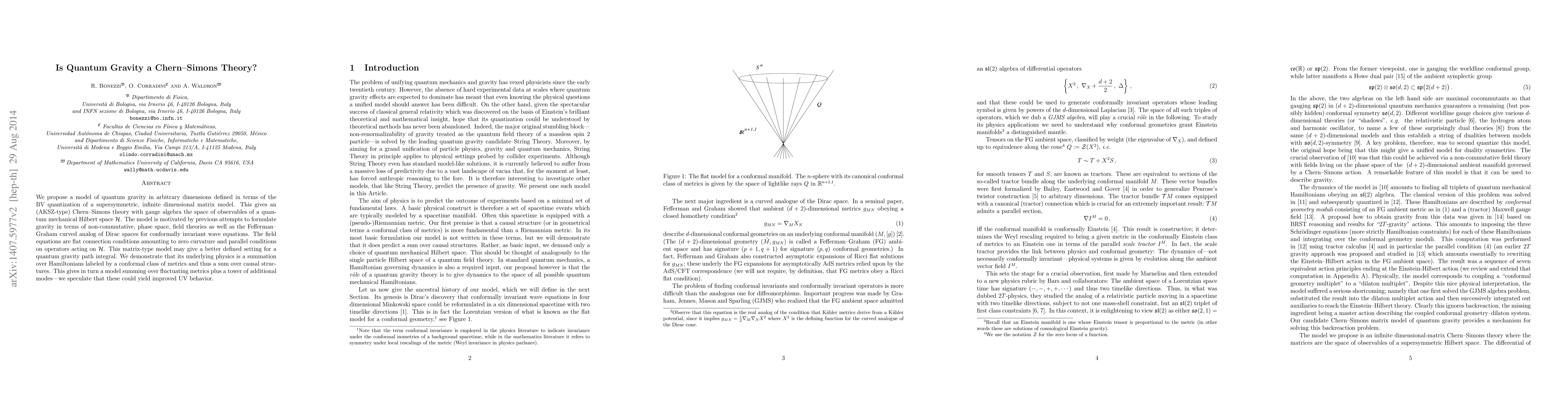 We propose a model of quantum gravity in arbitrary dimensions defined in terms of the BV quantization of a supersymmetric, infinite dimensional matrix model. This gives an (AKSZ-type) Chern-Simons theory with gauge algebra the space of observables of a quantum mechanical Hilbert space H. The model is motivated by previous attempts to formulate gravity in terms of non-commutative, phase space, field theories as well as the Fefferman-Graham curved analog of Dirac spaces for conformally invariant wave equations. The field equations are flat connection conditions amounting to zero curvature and parallel conditions on operators acting on H. This matrix-type model may give a better defined setting for a quantum gravity path integral. We demonstrate that its underlying physics is a summation over Hamiltonians labeled by a conformal class of metrics and thus a sum over causal structures. This gives in turn a model summing over fluctuating metrics plus a tower of additional modes-we speculate that these could yield improved UV behavior.