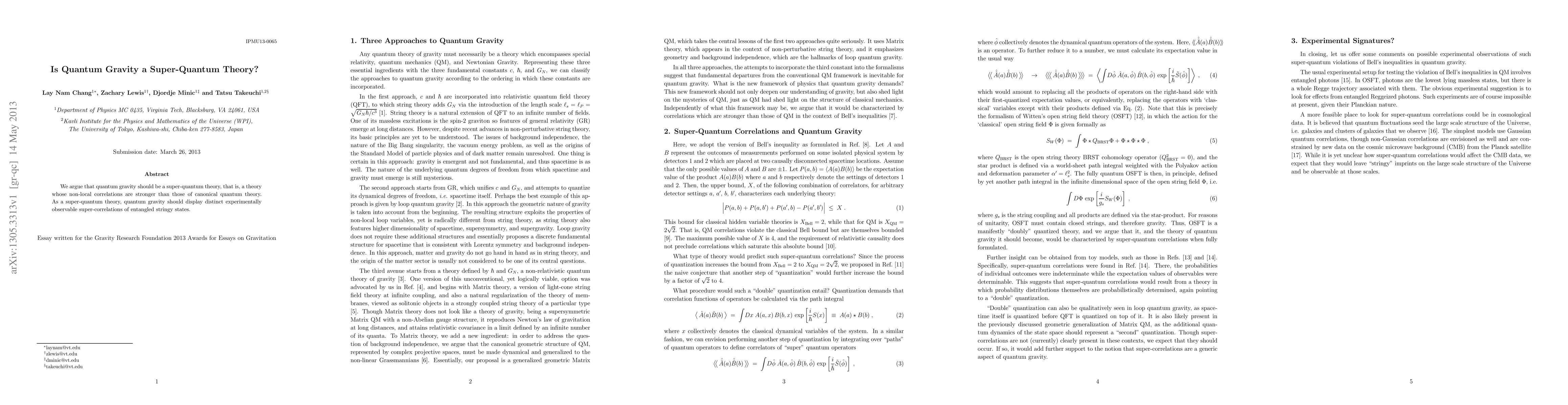 Summary: This paper proposes that quantum gravity should be considered a super-quantum theory, characterized by stronger non-local correlations than canonical quantum theory, potentially leading to experimentally observable super-correlations in entangled stringy states.