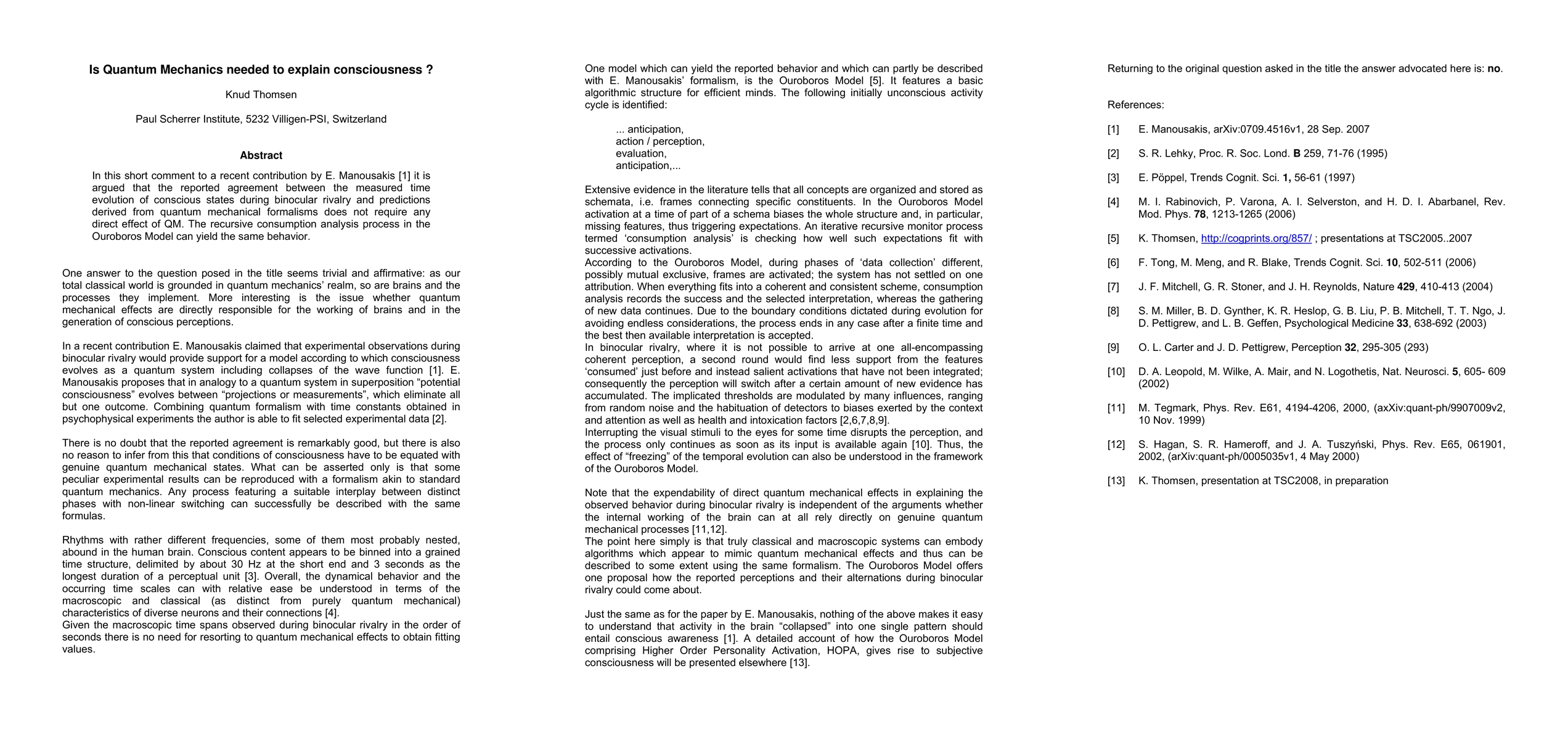 In this short comment to a recent contribution by E. Manousakis [1] it is argued that the reported agreement between the measured time evolution of conscious states during binocular rivalry and predictions derived from quantum mechanical formalisms does not require any direct effect of QM. The recursive consumption analysis process in the Ouroboros Model can yield the same behavior.