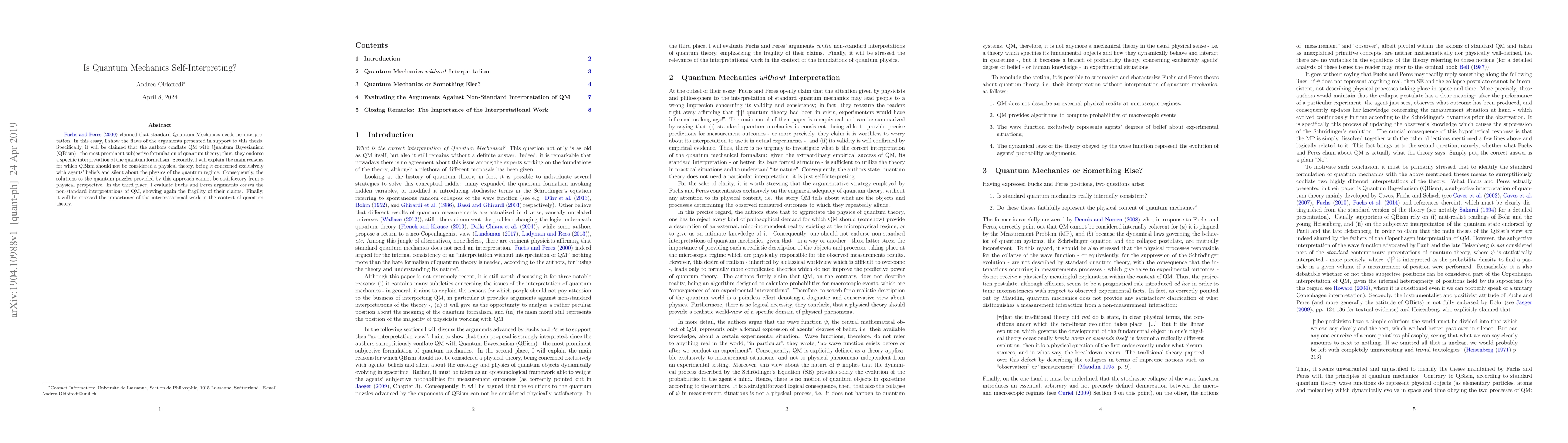 This paper challenges the claim that Quantum Mechanics requires no interpretation, instead arguing that Fuchs and Peres's arguments for self-existence of quantum mechanics are flawed due to the confusion with a subjective approach called Quantum Bayesianism.