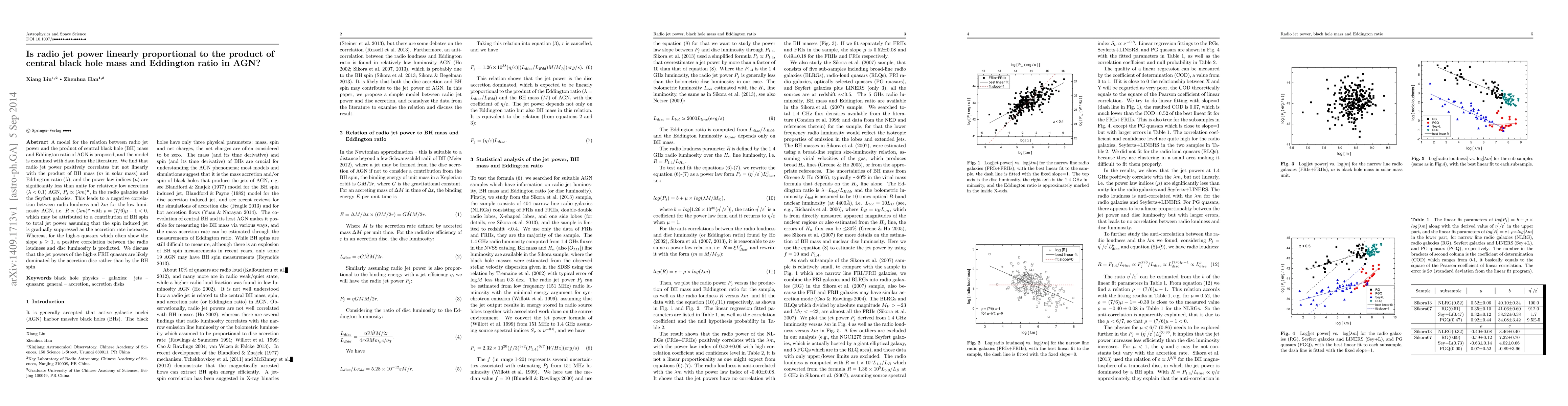 The study proposes a model linking radio jet power to the product of central black hole mass and Eddington ratio in AGN, finding a positive but non-linear correlation. For low accretion AGN, jet power is less than proportional to the product, suggesting BH spin influences jet power suppression.