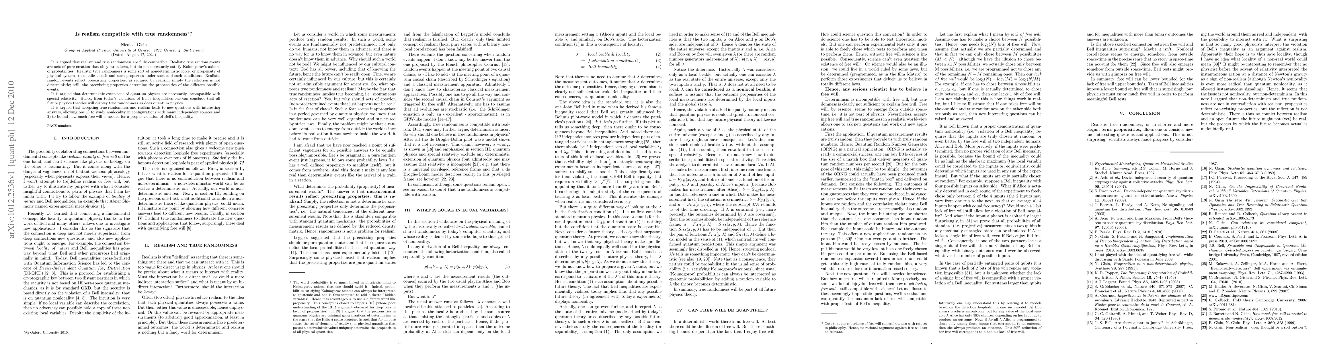This paper argues that realism and true randomness are compatible, positing that true random events are nondeterministic acts of creation governed by physical laws. It concludes that future physics theories will incorporate true randomness, leading to new insights on nonlocality and the extent of free will required for Bell's inequality violations.