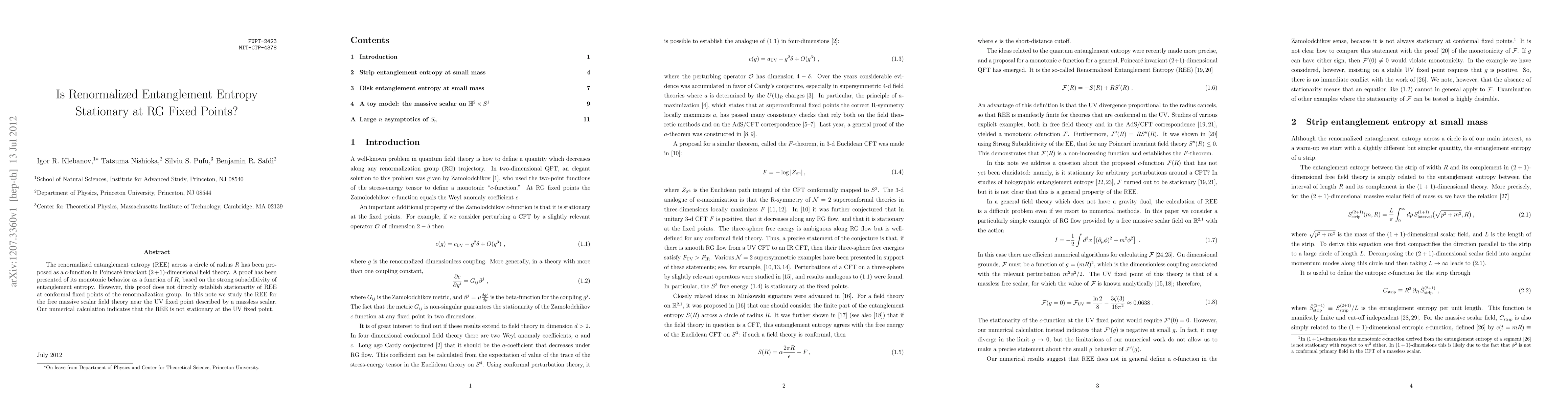 This paper investigates the renormalized entanglement entropy (REE) in (2+1)-dimensional field theory, finding that REE does not exhibit stationarity at the ultraviolet fixed point for the free massive scalar field theory, despite its monotonic behavior. This challenges the assumption of REE's constancy at conformal fixed points.