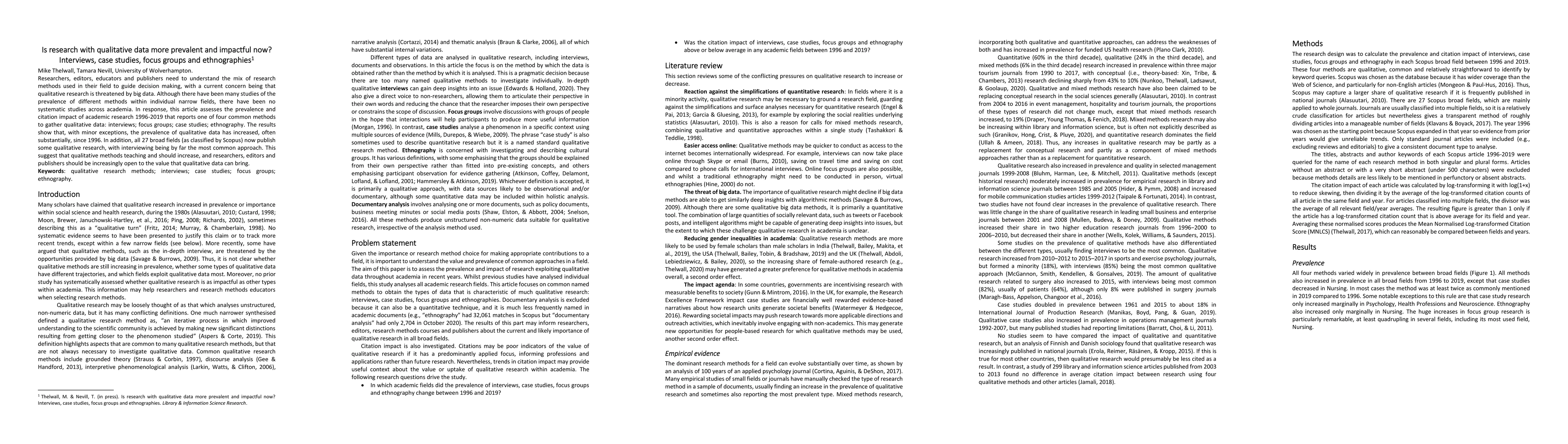 Researchers, editors, educators and publishers need to understand the mix of research methods used in their field to guide decision making, with a current concern being that qualitative research is threatened by big data. Although there have been many studies of the prevalence of different methods within individual narrow fields, there have been no systematic studies across academia. In response, this article assesses the prevalence and citation impact of academic research 1996-2019 that reports one of four common methods to gather qualitative data: interviews; focus groups; case studies; ethnography. The results show that, with minor exceptions, the prevalence of qualitative data has increased, often substantially, since 1996. In addition, all 27 broad fields (as classified by Scopus) now publish some qualitative research, with interviewing being by far the most common approach. This suggest that qualitative methods teaching and should increase, and researchers, editors and publishers should be increasingly open to the value that qualitative data can bring.