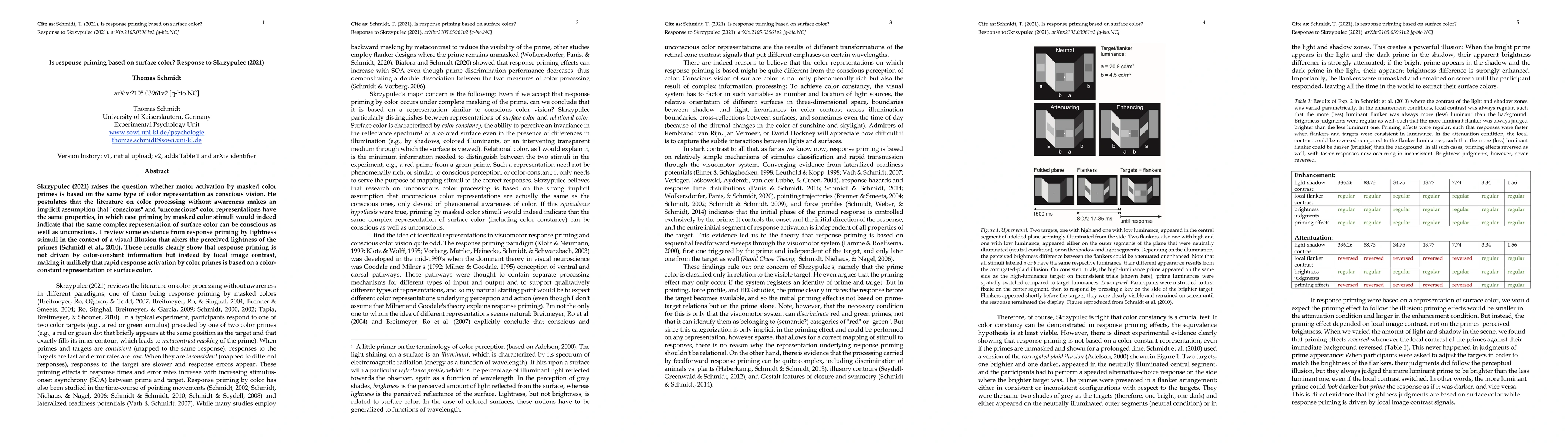 Skrzypulec (2021) raises the question whether motor activation by masked color primes is based on the same type of color representation as conscious vision. He postulates that the literature on color processing without awareness makes an implicit assumption that "conscious" and "unconscious" color representations have the same properties, in which case priming by masked color stimuli would indeed indicate that the same complex representation of surface color can be conscious as well as unconscious. I review some evidence from response priming by lightness stimuli in the context of a visual illusion that alters the perceived lightness of the primes (Schmidt et al., 2010). Those results clearly show that response priming is not driven by color-constant information but instead by local image contrast, making it unlikely that rapid response activation by color primes is based on a color-constant representation of surface color.
