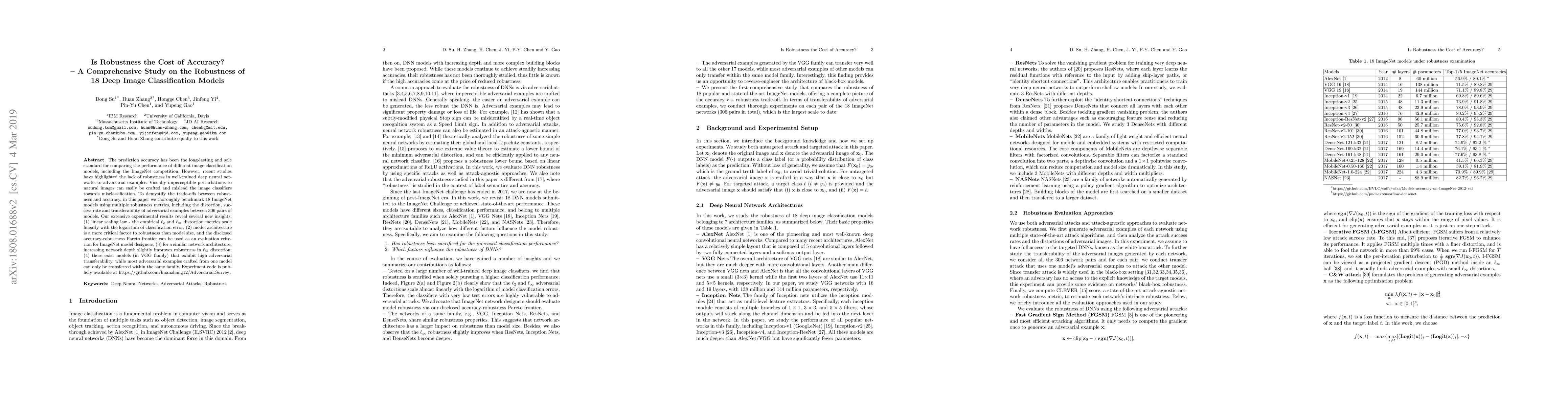 This paper benchmarks 18 ImageNet deep image classification models to explore the trade-off between robustness and accuracy, revealing that model architecture is more critical to robustness than size. It also finds that while deeper networks slightly improve $\ell_\infty$ robustness, some models show high adversarial transferability within families.