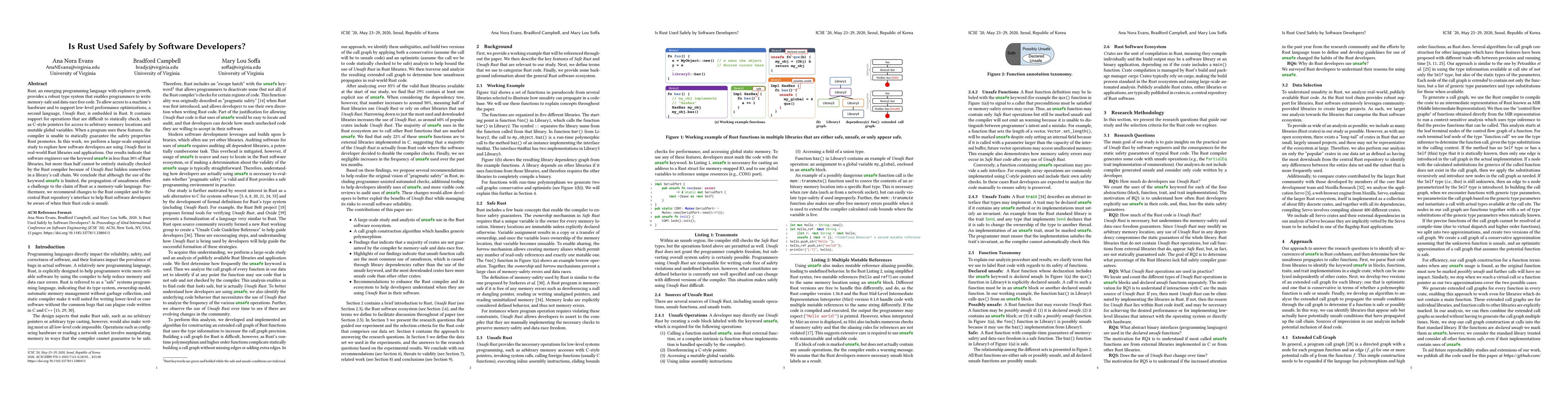 Rust, an emerging programming language with explosive growth, provides a robust type system that enables programmers to write memory-safe and data-race free code. To allow access to a machine's hardware and to support low-level performance optimizations, a second language, Unsafe Rust, is embedded in Rust. It contains support for operations that are difficult to statically check, such as C-style pointers for access to arbitrary memory locations and mutable global variables. When a program uses these features, the compiler is unable to statically guarantee the safety properties Rust promotes. In this work, we perform a large-scale empirical study to explore how software developers are using Unsafe Rust in real-world Rust libraries and applications. Our results indicate that software engineers use the keyword unsafe in less than 30% of Rust libraries, but more than half cannot be entirely statically checked by the Rust compiler because of Unsafe Rust hidden somewhere in a library's call chain. We conclude that although the use of the keyword unsafe is limited, the propagation of unsafeness offers a challenge to the claim of Rust as a memory-safe language. Furthermore, we recommend changes to the Rust compiler and to the central Rust repository's interface to help Rust software developers be aware of when their Rust code is unsafe.