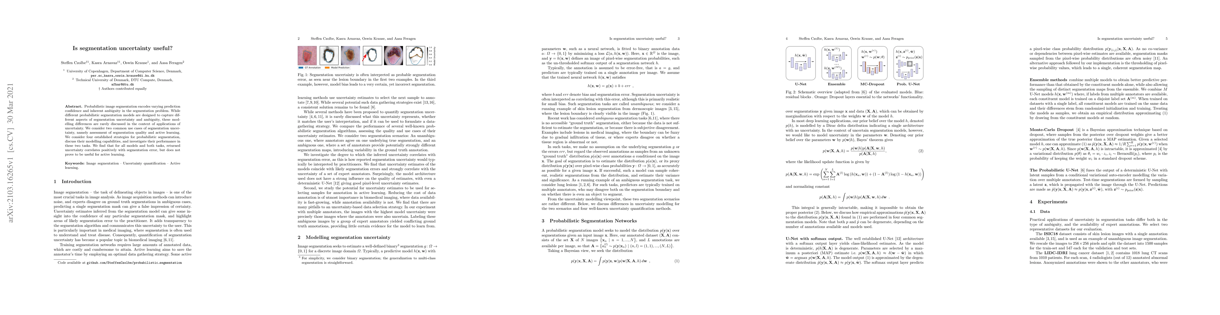 Probabilistic image segmentation encodes varying prediction confidence and inherent ambiguity in the segmentation problem. While different probabilistic segmentation models are designed to capture different aspects of segmentation uncertainty and ambiguity, these modelling differences are rarely discussed in the context of applications of uncertainty. We consider two common use cases of segmentation uncertainty, namely assessment of segmentation quality and active learning. We consider four established strategies for probabilistic segmentation, discuss their modelling capabilities, and investigate their performance in these two tasks. We find that for all models and both tasks, returned uncertainty correlates positively with segmentation error, but does not prove to be useful for active learning.