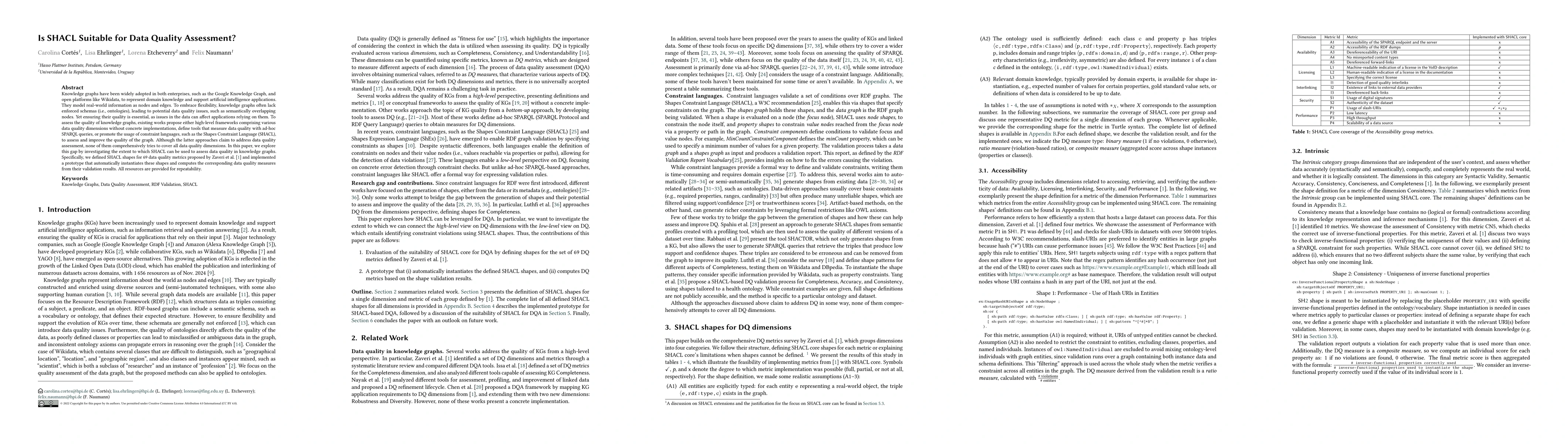 The paper investigates the suitability of SHACL for data quality assessment in knowledge graphs by defining SHACL shapes for 69 data quality metrics and implementing a prototype to compute corresponding measures.