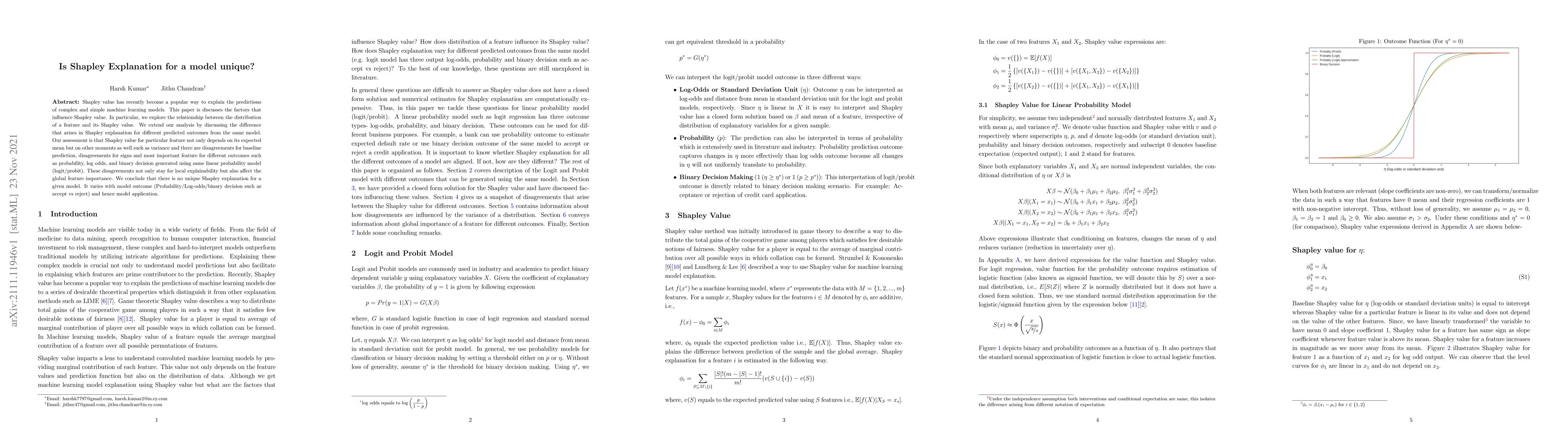 Shapley value has recently become a popular way to explain the predictions of complex and simple machine learning models. This paper is discusses the factors that influence Shapley value. In particular, we explore the relationship between the distribution of a feature and its Shapley value. We extend our analysis by discussing the difference that arises in Shapley explanation for different predicted outcomes from the same model. Our assessment is that Shapley value for particular feature not only depends on its expected mean but on other moments as well such as variance and there are disagreements for baseline prediction, disagreements for signs and most important feature for different outcomes such as probability, log odds, and binary decision generated using same linear probability model (logit/probit). These disagreements not only stay for local explainability but also affect the global feature importance. We conclude that there is no unique Shapley explanation for a given model. It varies with model outcome (Probability/Log-odds/binary decision such as accept vs reject) and hence model application.
