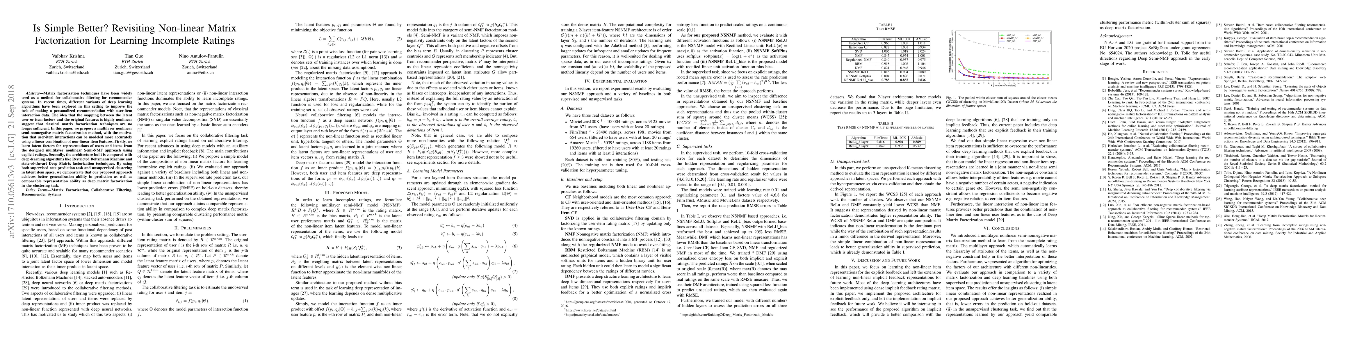 This paper proposes a multilayer nonlinear semi-nonnegative matrix factorization method to improve collaborative filtering in recommender systems, demonstrating better generalization and comparable clustering performance compared to deep learning alternatives. The approach uses a linear combination of non-linear item features to model user-item interactions more accurately.