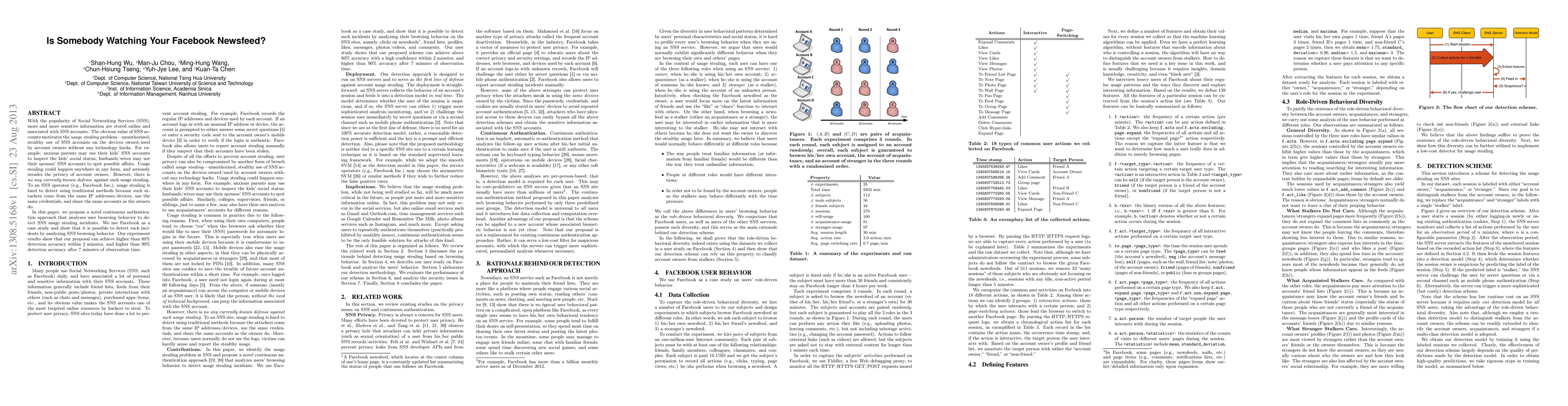 With the popularity of Social Networking Services (SNS), more and more sensitive information are stored online and associated with SNS accounts. The obvious value of SNS accounts motivates the usage stealing problem -- unauthorized, stealthy use of SNS accounts on the devices owned/used by account owners without any technology hacks. For example, anxious parents may use their kids' SNS accounts to inspect the kids' social status; husbands/wives may use their spouses' SNS accounts to spot possible affairs. Usage stealing could happen anywhere in any form, and seriously invades the privacy of account owners. However, there is no any currently known defense against such usage stealing. To an SNS operator (e.g., Facebook Inc.), usage stealing is hard to detect using traditional methods because such attackers come from the same IP addresses/devices, use the same credentials, and share the same accounts as the owners do. In this paper, we propose a novel continuous authentication approach that analyzes user browsing behavior to detect SNS usage stealing incidents. We use Facebook as a case study and show that it is possible to detect such incidents by analyzing SNS browsing behavior. Our experiment results show that our proposal can achieve higher than 80% detection accuracy within 2 minutes, and higher than 90% detection accuracy after 7 minutes of observation time.