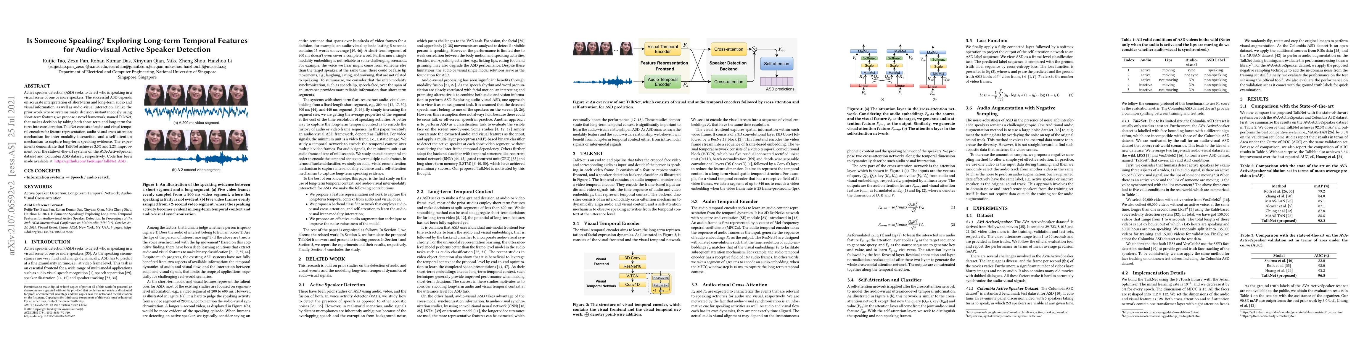 Active speaker detection (ASD) seeks to detect who is speaking in a visual scene of one or more speakers. The successful ASD depends on accurate interpretation of short-term and long-term audio and visual information, as well as audio-visual interaction. Unlike the prior work where systems make decision instantaneously using short-term features, we propose a novel framework, named TalkNet, that makes decision by taking both short-term and long-term features into consideration. TalkNet consists of audio and visual temporal encoders for feature representation, audio-visual cross-attention mechanism for inter-modality interaction, and a self-attention mechanism to capture long-term speaking evidence. The experiments demonstrate that TalkNet achieves 3.5% and 2.2% improvement over the state-of-the-art systems on the AVA-ActiveSpeaker dataset and Columbia ASD dataset, respectively. Code has been made available at: https://github.com/TaoRuijie/TalkNet_ASD.