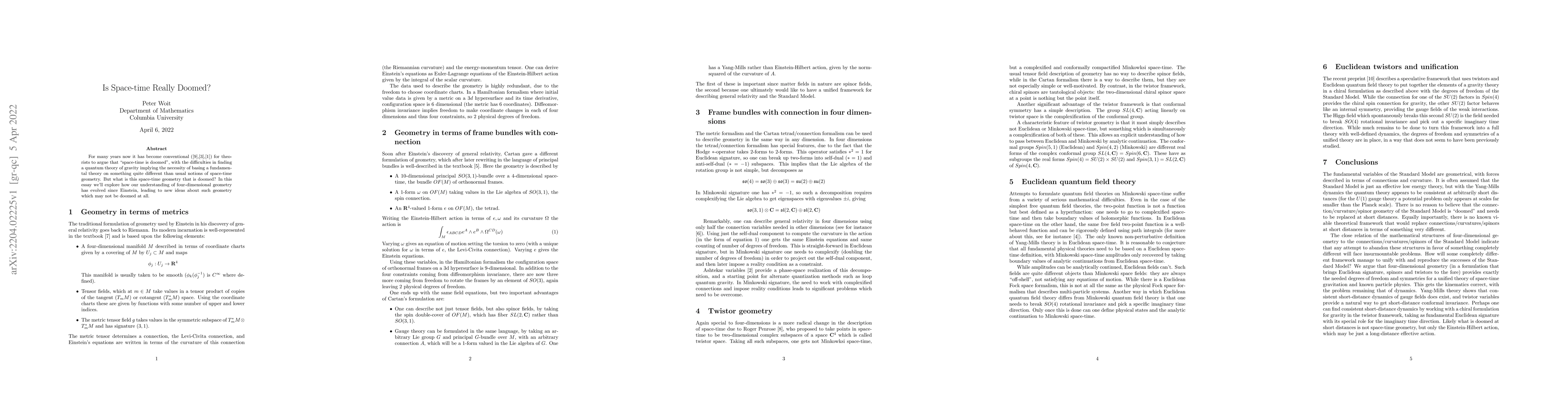 This paper examines the conventional belief that space-time is doomed due to challenges in formulating a quantum theory of gravity, suggesting that recent advancements in our understanding of four-dimensional geometry may indicate that space-time is not as doomed as previously thought.