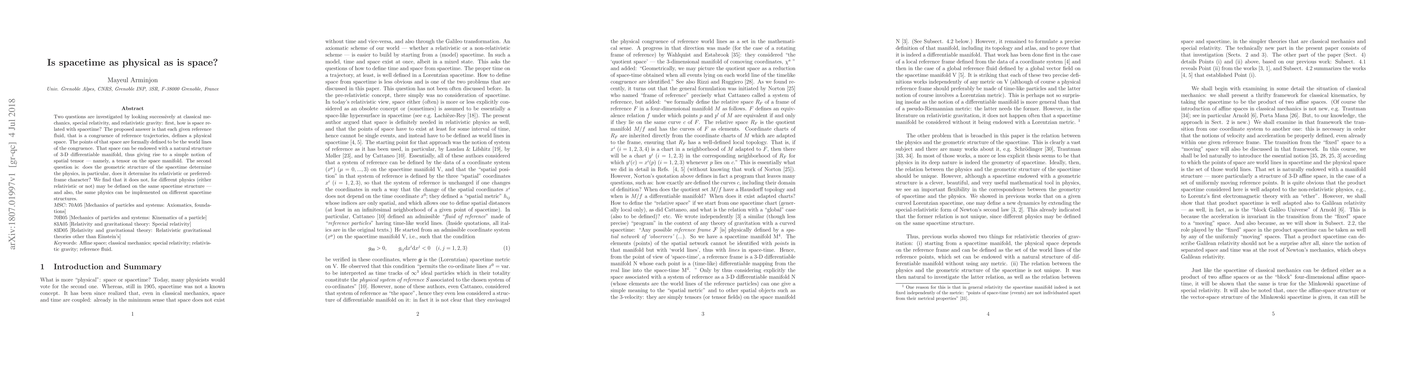 Two questions are investigated by looking successively at classical mechanics, special relativity, and relativistic gravity: first, how is space related with spacetime? The proposed answer is that each given reference fluid, that is a congruence of reference trajectories, defines a physical space. The points of that space are formally defined to be the world lines of the congruence. That space can be endowed with a natural structure of 3-D differentiable manifold, thus giving rise to a simple notion of spatial tensor --- namely, a tensor on the space manifold. The second question is: does the geometric structure of the spacetime determine the physics, in particular, does it determine its relativistic or preferred-frame character? We find that it does not, for different physics (either relativistic or not) may be defined on the same spacetime structure --- and also, the same physics can be implemented on different spacetime structures. Keywords: Affine space; classical mechanics; special relativity; relativistic gravity; reference fluid.