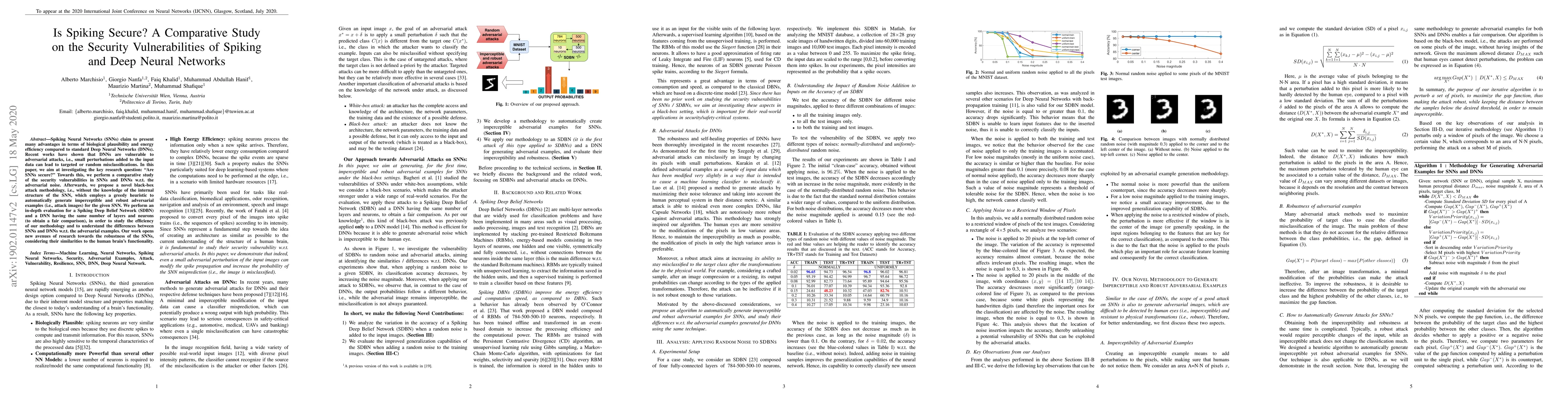 Spiking Neural Networks (SNNs) claim to present many advantages in terms of biological plausibility and energy efficiency compared to standard Deep Neural Networks (DNNs). Recent works have shown that DNNs are vulnerable to adversarial attacks, i.e., small perturbations added to the input data can lead to targeted or random misclassifications. In this paper, we aim at investigating the key research question: ``Are SNNs secure?'' Towards this, we perform a comparative study of the security vulnerabilities in SNNs and DNNs w.r.t. the adversarial noise. Afterwards, we propose a novel black-box attack methodology, i.e., without the knowledge of the internal structure of the SNN, which employs a greedy heuristic to automatically generate imperceptible and robust adversarial examples (i.e., attack images) for the given SNN. We perform an in-depth evaluation for a Spiking Deep Belief Network (SDBN) and a DNN having the same number of layers and neurons (to obtain a fair comparison), in order to study the efficiency of our methodology and to understand the differences between SNNs and DNNs w.r.t. the adversarial examples. Our work opens new avenues of research towards the robustness of the SNNs, considering their similarities to the human brain's functionality.