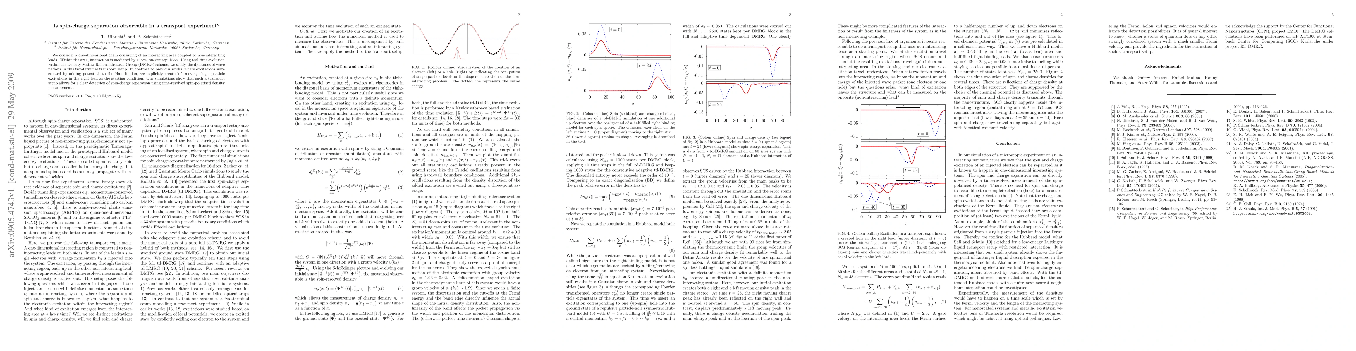 This study investigates a one-dimensional interacting electron chain connected to non-interacting leads using the Density Matrix Renormalisation Group (DMRG) method. The research reveals that spin-charge separation can be clearly detected in a transport experiment through time-resolved spin-polarised density measurements when left-moving single particle excitations are introduced in the right lead.