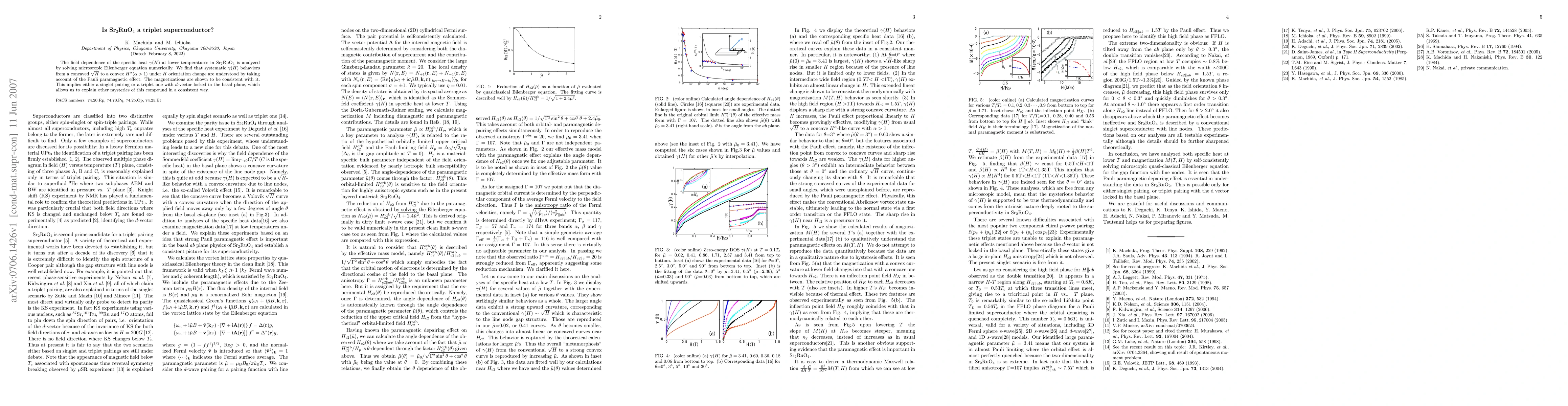 The field dependence of the specific heat \gamma(H) at lower temperatures in Sr2RuO4 is analyzed by solving microscopic Eilenberger equation numerically. We find that systematic \gamma(H) behaviors from a concaved \sqrt H to a convex H^{\alpha} (\alpha>1) under H orientation change are understood by taking account of the Pauli paramagnetic effect. The magnetizations are shown to be consistent with it. This implies either a singlet pairing or a triplet one with d-vector locked in the basal plane, which allows us to explain other mysteries of this compound in a consistent way.