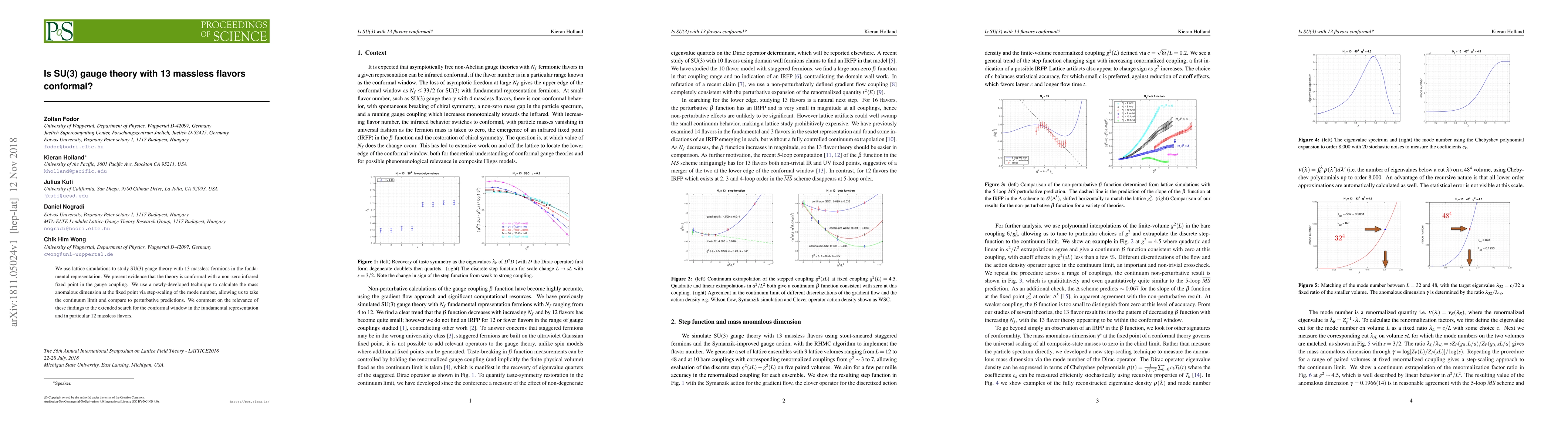 We use lattice simulations to study SU(3) gauge theory with 13 massless fermions in the fundamental representation. We present evidence that the theory is conformal with a non-zero infrared fixed point in the gauge coupling. We use a newly-developed technique to calculate the mass anomalous dimension at the fixed point via step-scaling of the mode number, allowing us to take the continuum limit and compare to perturbative predictions. We comment on the relevance of these findings to the extended search for the conformal window in the fundamental representation and in particular 12 massless flavors.