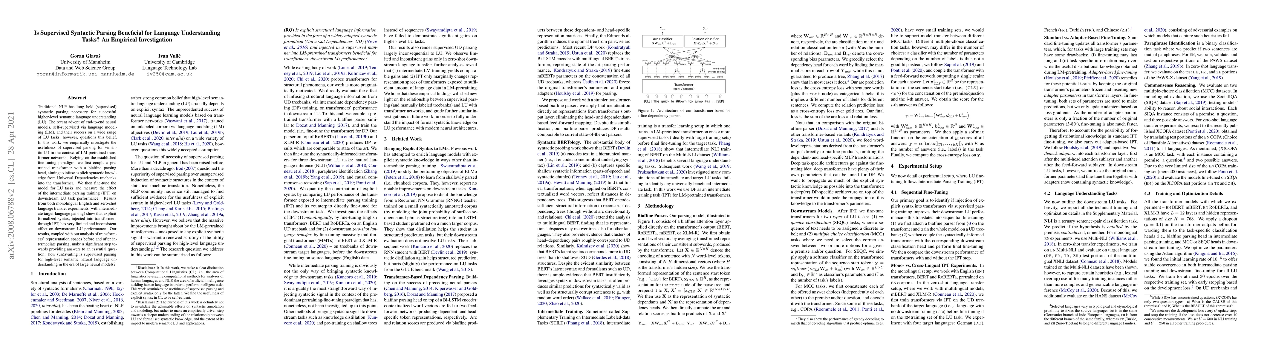 Traditional NLP has long held (supervised) syntactic parsing necessary for successful higher-level semantic language understanding (LU). The recent advent of end-to-end neural models, self-supervised via language modeling (LM), and their success on a wide range of LU tasks, however, questions this belief. In this work, we empirically investigate the usefulness of supervised parsing for semantic LU in the context of LM-pretrained transformer networks. Relying on the established fine-tuning paradigm, we first couple a pretrained transformer with a biaffine parsing head, aiming to infuse explicit syntactic knowledge from Universal Dependencies treebanks into the transformer. We then fine-tune the model for LU tasks and measure the effect of the intermediate parsing training (IPT) on downstream LU task performance. Results from both monolingual English and zero-shot language transfer experiments (with intermediate target-language parsing) show that explicit formalized syntax, injected into transformers through IPT, has very limited and inconsistent effect on downstream LU performance. Our results, coupled with our analysis of transformers' representation spaces before and after intermediate parsing, make a significant step towards providing answers to an essential question: how (un)availing is supervised parsing for high-level semantic natural language understanding in the era of large neural models?