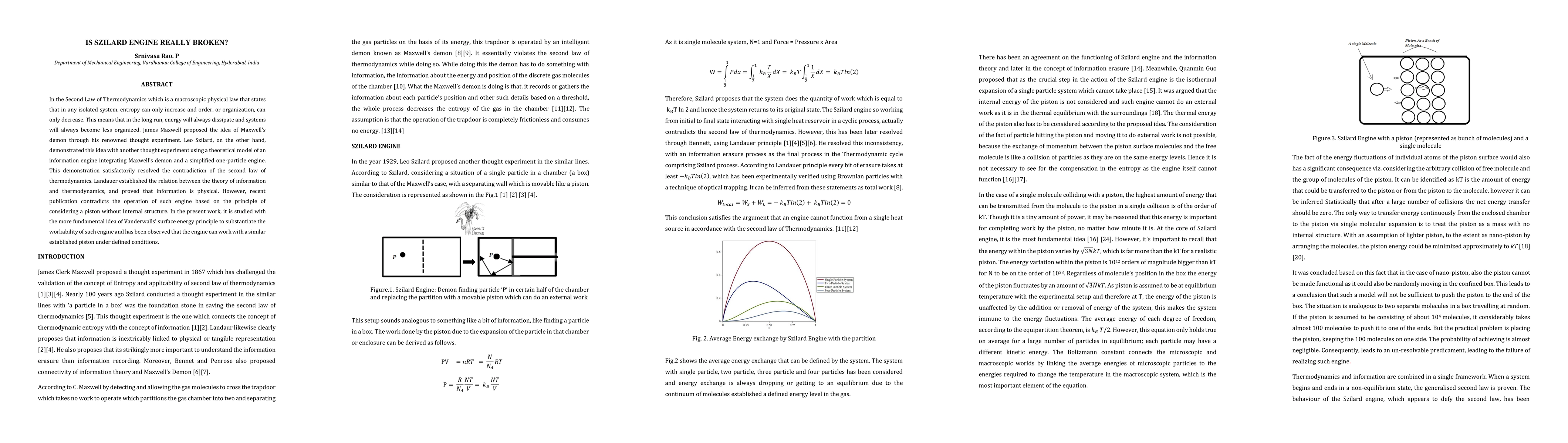 This paper investigates the functionality of the Szilard Engine, a theoretical model that integrates the Maxwell demon concept and a one-particle engine, to resolve the second law of thermodynamics. It refutes recent claims that the engine is broken by applying the Vanderwalls surface energy principle, demonstrating its potential operation under specific conditions.