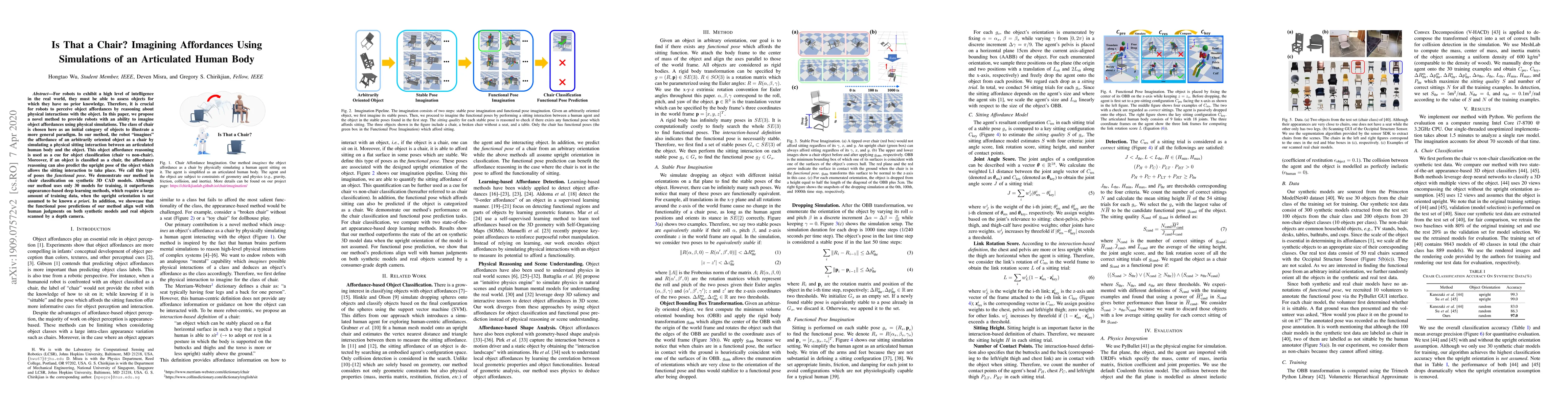 This paper proposes a novel method for robots to infer object affordances through physical simulations, specifically focusing on determining whether an object can function as a chair. The method simulates human-object interactions to classify objects and predict their functional poses, outperforming appearance-based deep learning methods in chair classification.