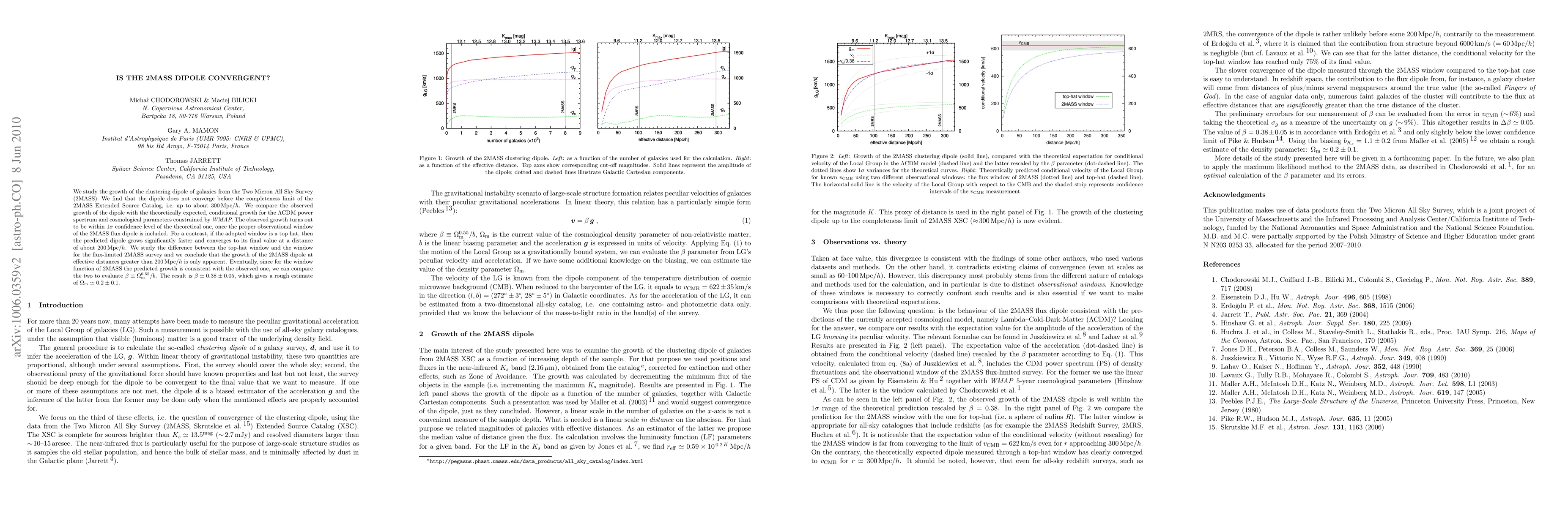 The study finds that the clustering dipole of galaxies from the 2MASS survey does not converge before reaching the survey's completeness limit, approximately 300 Mpc/h. The observed dipole growth aligns with theoretical predictions within 1-sigma confidence, suggesting a rough estimate of Omega_m = 0.2+-0.1.