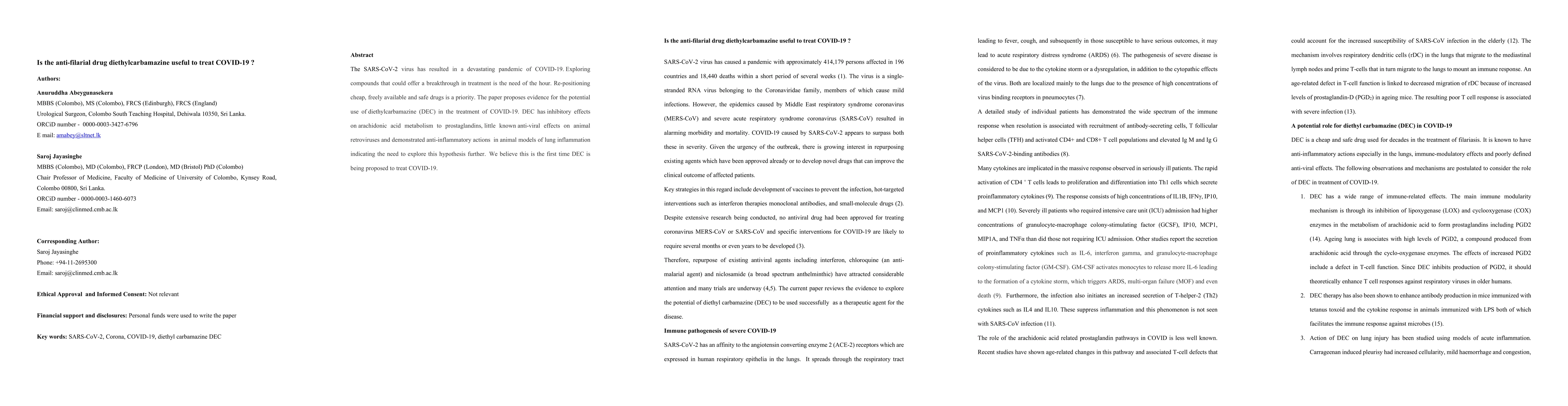 The SARS-CoV-2 virus has resulted in a devastating pandemic of COVID-19. Exploring compounds that could offer a breakthrough in treatment is the need of the hour. Re-positioning cheap, freely available and safe drugs is a priority. The paper proposes evidence for the potential use of diethylcarbamazine (DEC) in the treatment of COVID-19. DEC has inhibitory effects on arachidonic acid metabolism to prostaglandins, little known anti-viral effects on animal retroviruses and demonstrated anti-inflammatory actions in animal models of lung inflammation indicating the need to explore this hypothesis further. We believe this is the first time DEC is being proposed to treat COVID-19.