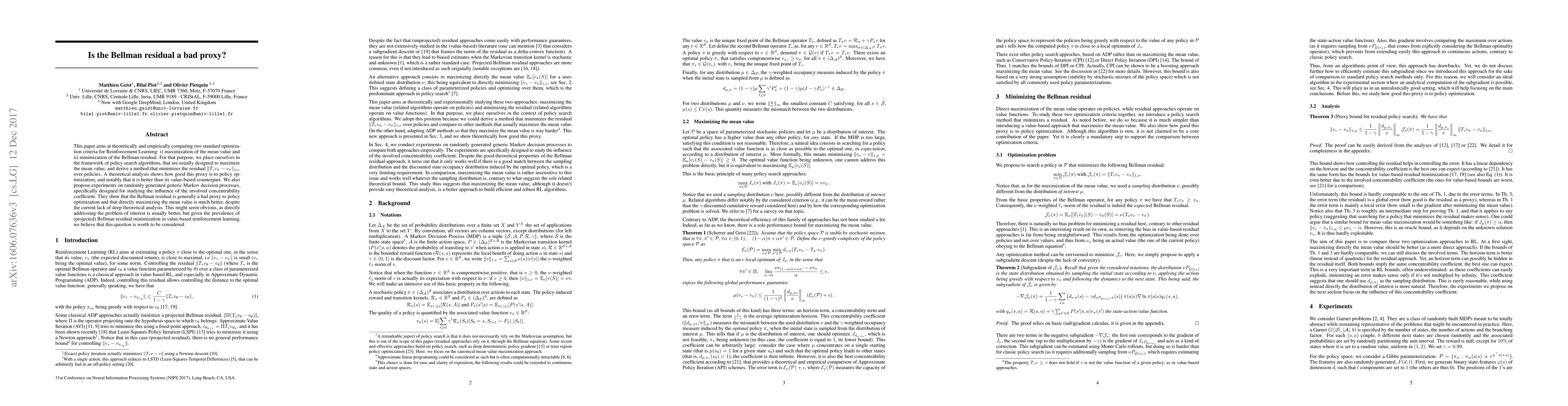 This paper aims at theoretically and empirically comparing two standard optimization criteria for Reinforcement Learning: i) maximization of the mean value and ii) minimization of the Bellman residual. For that purpose, we place ourselves in the framework of policy search algorithms, that are usually designed to maximize the mean value, and derive a method that minimizes the residual $\|T_* v_\pi - v_\pi\|_{1,\nu}$ over policies. A theoretical analysis shows how good this proxy is to policy optimization, and notably that it is better than its value-based counterpart. We also propose experiments on randomly generated generic Markov decision processes, specifically designed for studying the influence of the involved concentrability coefficient. They show that the Bellman residual is generally a bad proxy to policy optimization and that directly maximizing the mean value is much better, despite the current lack of deep theoretical analysis. This might seem obvious, as directly addressing the problem of interest is usually better, but given the prevalence of (projected) Bellman residual minimization in value-based reinforcement learning, we believe that this question is worth to be considered.