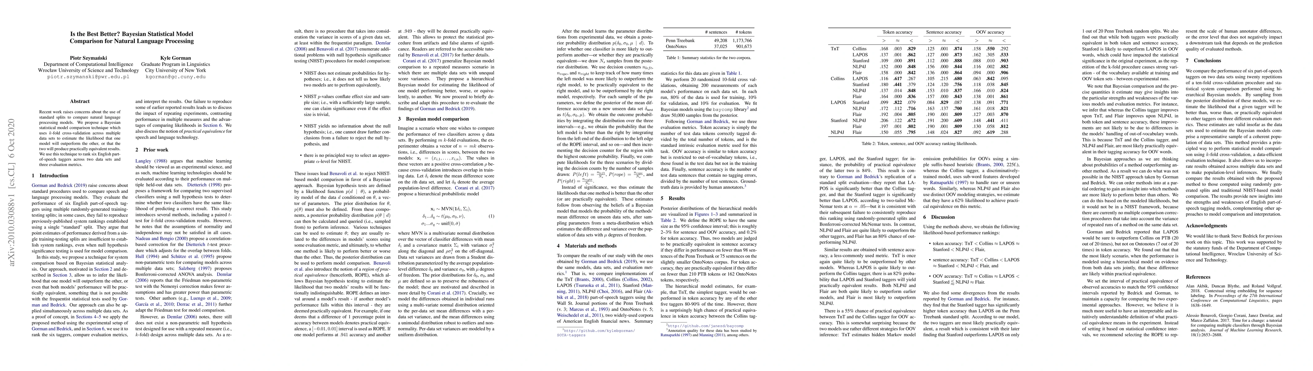This paper proposes a Bayesian statistical model comparison method using k-fold cross-validation across multiple datasets to determine if one natural language processing model outperforms another. The technique is applied to rank six English part-of-speech taggers based on their performance across two datasets and three metrics.