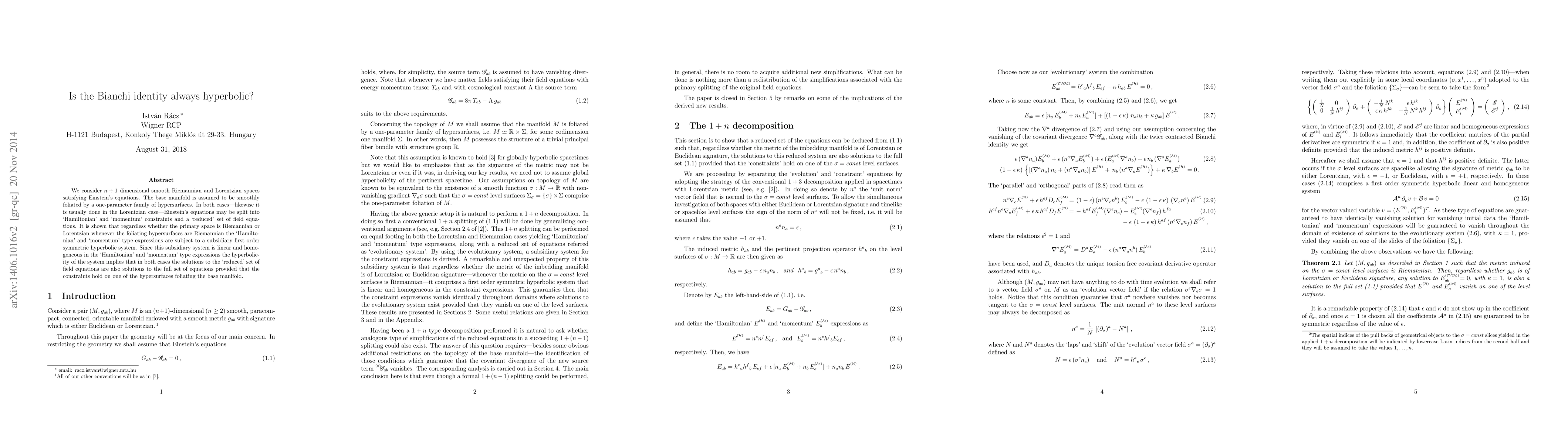 We consider $n+1$ dimensional smooth Riemannian and Lorentzian spaces satisfying Einstein's equations. The base manifold is assumed to be smoothly foliated by a one-parameter family of hypersurfaces. In both cases---likewise it is usually done in the Lorentzian case---Einstein's equations may be split into `Hamiltonian' and `momentum' constraints and a `reduced' set of field equations. It is shown that regardless whether the primary space is Riemannian or Lorentzian whenever the foliating hypersurfaces are Riemannian the `Hamiltonian' and `momentum' type expressions are subject to a subsidiary first order symmetric hyperbolic system. Since this subsidiary system is linear and homogeneous in the `Hamiltonian' and `momentum' type expressions the hyperbolicity of the system implies that in both cases the solutions to the `reduced' set of field equations are also solutions to the full set of equations provided that the constraints hold on one of the hypersurfaces foliating the base manifold.