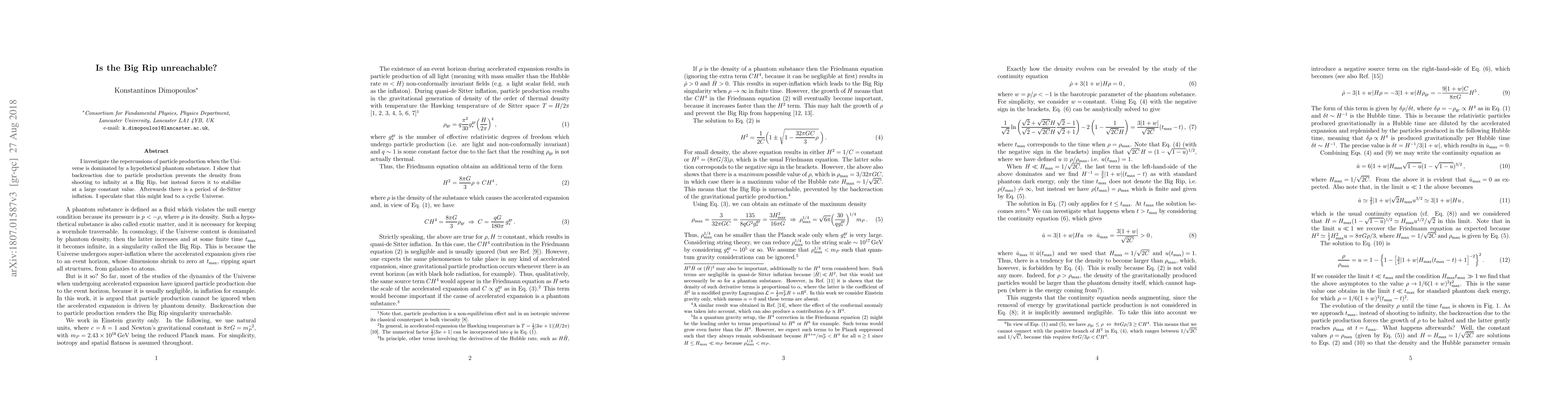 The paper explores the impact of phantom energy on the Big Rip scenario, demonstrating that particle production prevents the density from reaching infinity, stabilizing it instead and initiating a de-Sitter inflationary phase, potentially leading to a cyclic universe model.