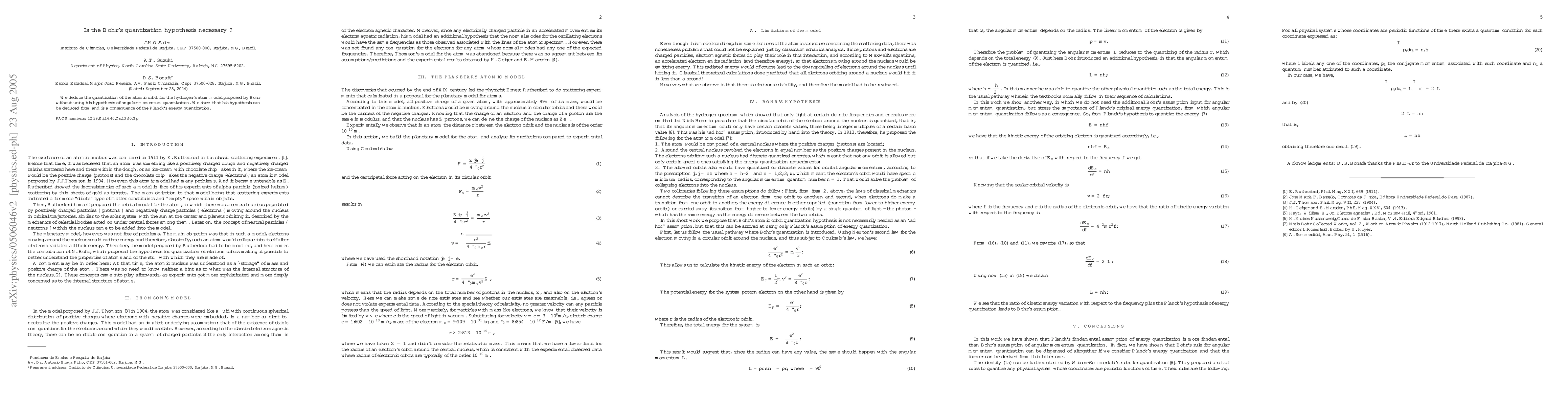 Researchers show that Bohr's quantization hypothesis is unnecessary for explaining atomic orbit quantization, as it can be derived from Planck's energy quantization.