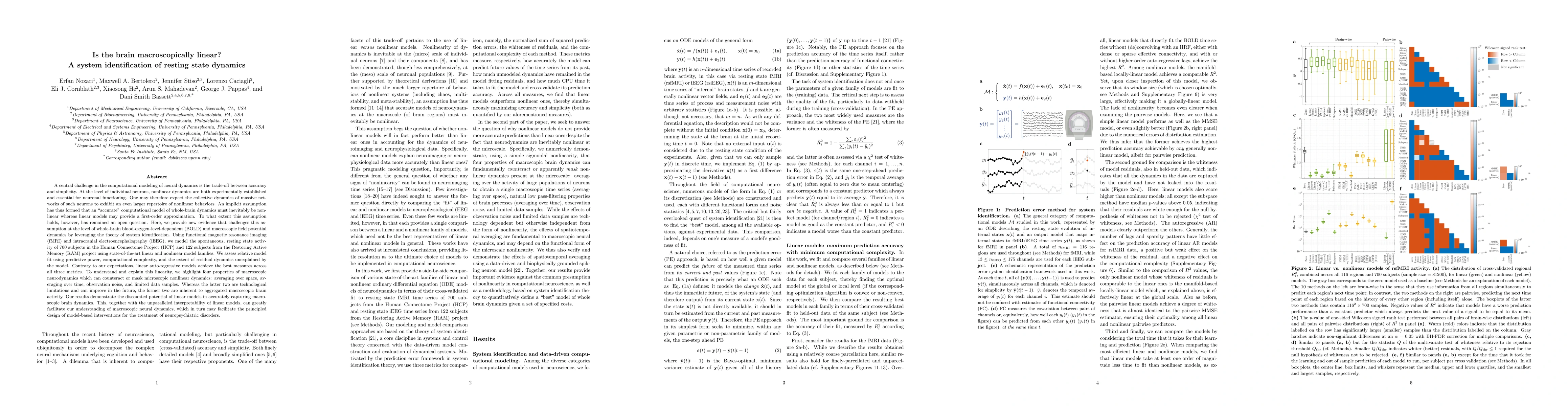 A central challenge in the computational modeling of neural dynamics is the trade-off between accuracy and simplicity. At the level of individual neurons, nonlinear dynamics are both experimentally established and essential for neuronal functioning. An implicit assumption has thus formed that an accurate computational model of whole-brain dynamics must also be highly nonlinear, whereas linear models may provide a first-order approximation. Here, we provide a rigorous and data-driven investigation of this hypothesis at the level of whole-brain blood-oxygen-level-dependent (BOLD) and macroscopic field potential dynamics by leveraging the theory of system identification. Using functional MRI (fMRI) and intracranial EEG (iEEG), we model the resting state activity of 700 subjects in the Human Connectome Project (HCP) and 122 subjects from the Restoring Active Memory (RAM) project using state-of-the-art linear and nonlinear model families. We assess relative model fit using predictive power, computational complexity, and the extent of residual dynamics unexplained by the model. Contrary to our expectations, linear auto-regressive models achieve the best measures across all three metrics, eliminating the trade-off between accuracy and simplicity. To understand and explain this linearity, we highlight four properties of macroscopic neurodynamics which can counteract or mask microscopic nonlinear dynamics: averaging over space, averaging over time, observation noise, and limited data samples. Whereas the latter two are technological limitations and can improve in the future, the former two are inherent to aggregated macroscopic brain activity. Our results, together with the unparalleled interpretability of linear models, can greatly facilitate our understanding of macroscopic neural dynamics and the principled design of model-based interventions for the treatment of neuropsychiatric disorders.