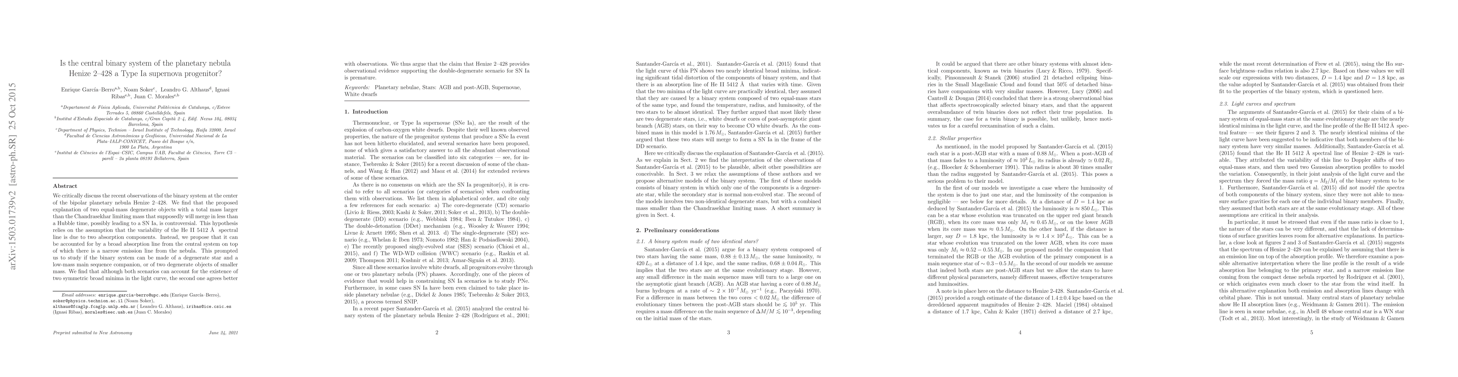 We critically discuss the recent observations of the binary system at the center of the bipolar planetary nebula Henize 2-428. We find that the proposed explanation of two equal-mass degenerate objects with a total mass larger than the Chandrasekhar limiting mass that supposedly will merge in less than a Hubble time, possibly leading to a SN~Ia, is controversial. This hypothesis relies on the assumption that the variability of the He II 5412A spectral line is due to two absorption components. Instead, we propose that it can be accounted for by a broad absorption line from the central system on top of which there is a narrow emission line from the nebula. This prompted us to study if the binary system can be made of a degenerate star and a low-mass main sequence companion, or of two degenerate objects of smaller mass. We find that although both scenarios can account for the existence of two symmetric broad minima in the light curve, the second one agrees better with observations. We thus argue that the claim that Henize 2-428 provides observational evidence supporting the double-degenerate scenario for SN~Ia is premature.