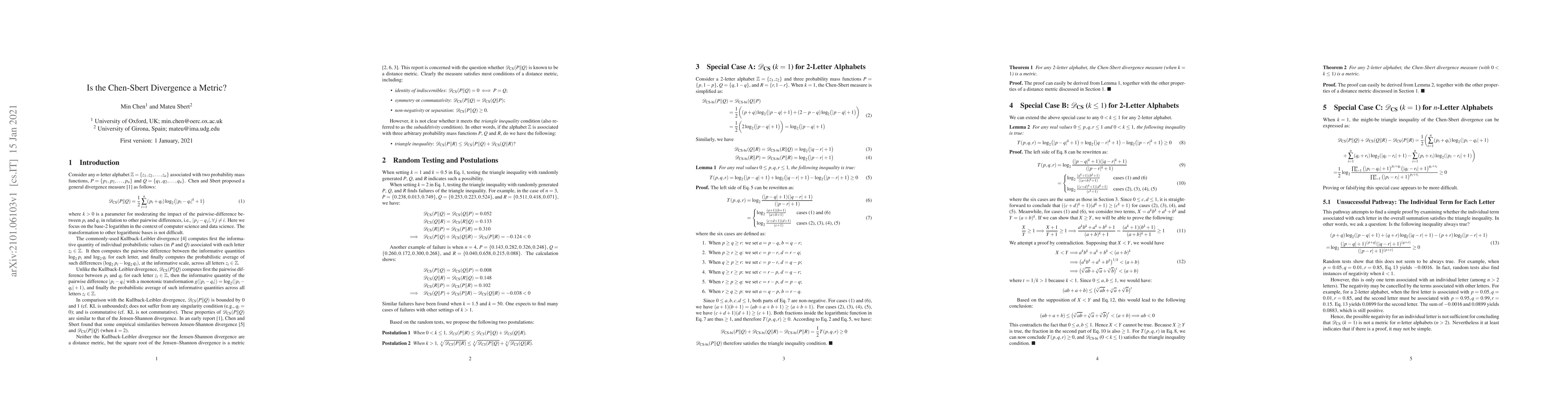 The paper presents detailed mathematical proofs and lemmas supporting the metric properties of the Chen-Sbert divergence for specific cases, particularly for 0 < k ≤ 1 in 2-letter alphabets.