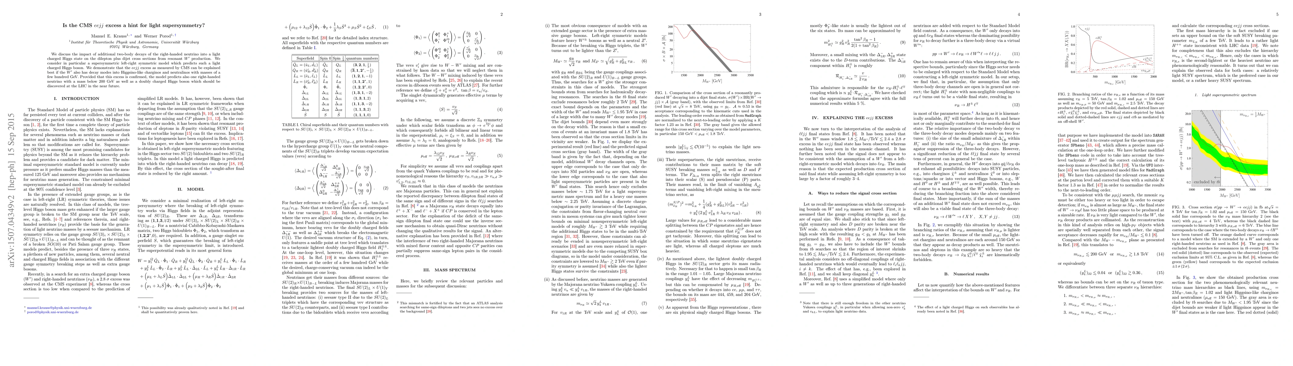 We discuss the impact of additional two-body decays of the right-handed neutrino into a light charged Higgs state on the dilepton plus dijet cross sections from resonant $W'$ production. We consider in particular a supersymmetric left-right symmetric model which predicts such a light charged Higgs boson. We demonstrate that the $eejj$ excess as measured by CMS can be explained best if the $W'$ also has decay modes into Higgsino-like charginos and neutralinos with masses of a few hundred GeV. Provided that this excess is confirmed, the model predicts also one right-handed neutrino with a mass below 200 GeV as well as a doubly charged Higgs boson which should be discovered at the LHC in the near future.