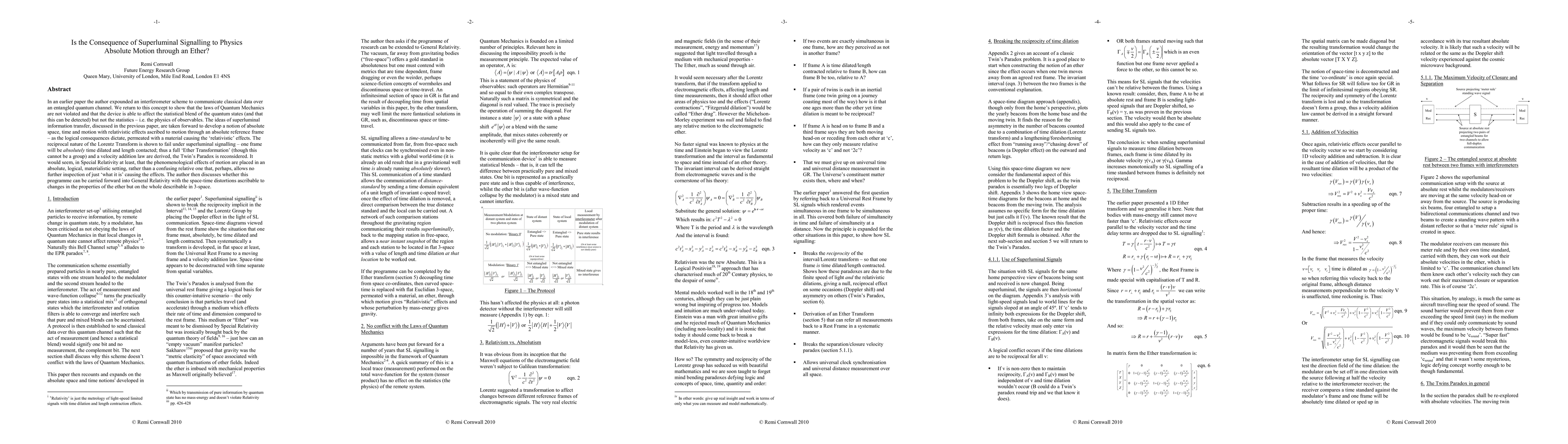 In an earlier paper the author expounded an interferometer scheme to communicate classical data over an entangled quantum channel. We return to this concept to show that the laws of Quantum Mechanics are not violated and that the device is able to affect the statistical blend of the quantum states (and that this can be detected) but not the statistics - i.e. the physics of observables. The ideas of superluminal information transfer, discussed in the previous paper, are taken forward to develop a notion of absolute space, time and motion with relativistic effects ascribed to motion through an absolute reference frame - as the logical consequences dictate, permeated with a material causing the 'relativistic' effects. The reciprocal nature of the Lorentz Transform is shown to fail under superluminal signalling - one frame will be absolutely time dilated and length contacted; thus a full 'Ether Transformation' (though this cannot be a group) and a velocity addition law are derived, the Twin's Paradox is reconsidered. It would seem, in Special Relativity at least, that the phenomenological effects of motion are placed in an absolute, logical, materialistic setting, rather than a confusing relative one that, perhaps, allows no further inspection of just 'what it is' causing the effects. The author then discusses whether this programme can be carried forward into General Relativity with the space-time distortions ascribable to changes in the properties of the ether but on the whole describable in 3-space.