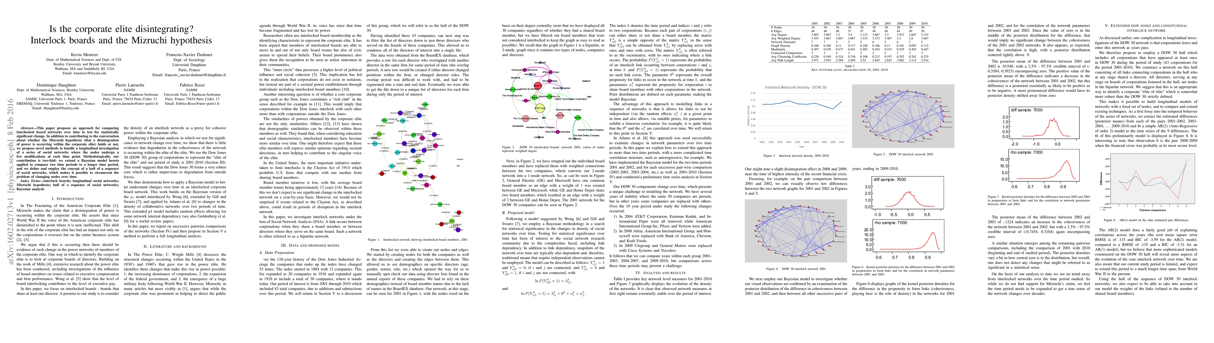 This paper proposes an approach for comparing interlocked board networks over time to test for statistically significant change. In addition to contributing to the conversation about whether the Mizruchi hypothesis (that a disintegration of power is occurring within the corporate elite) holds or not, we propose novel methods to handle a longitudinal investigation of a series of social networks where the nodes undergo a few modifications at each time point. Methodologically, our contribution is twofold: we extend a Bayesian model hereto applied to compare two time periods to a longer time period, and we define and employ the concept of a hull of a sequence of social networks, which makes it possible to circumvent the problem of changing nodes over time.
