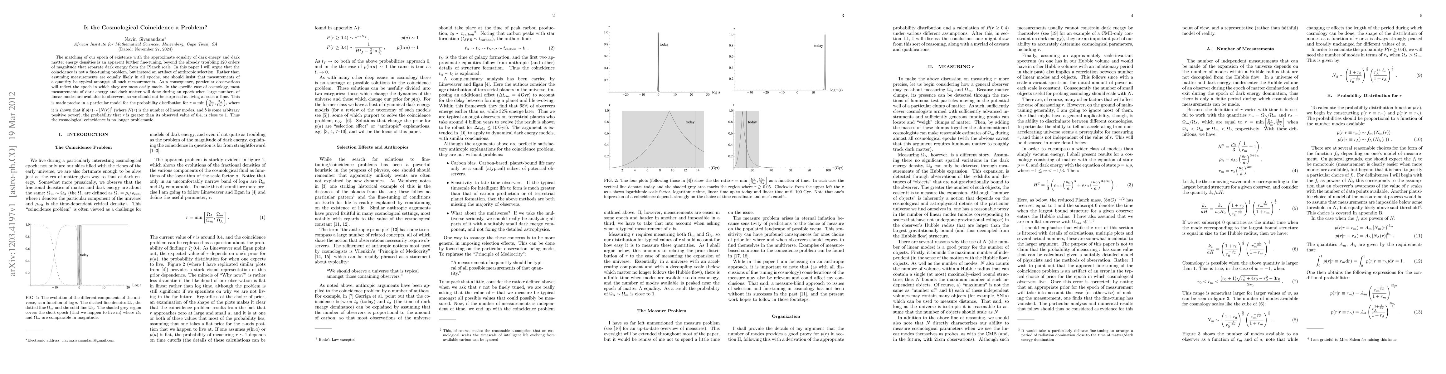 This paper argues that the cosmological coincidence—the matching of dark energy and dark matter densities at our epoch—is not a fine-tuning problem but an anthropic artifact. It posits that observations reflect the epoch in which they are most easily made, thus explaining why we live in a time when these densities are nearly equal.