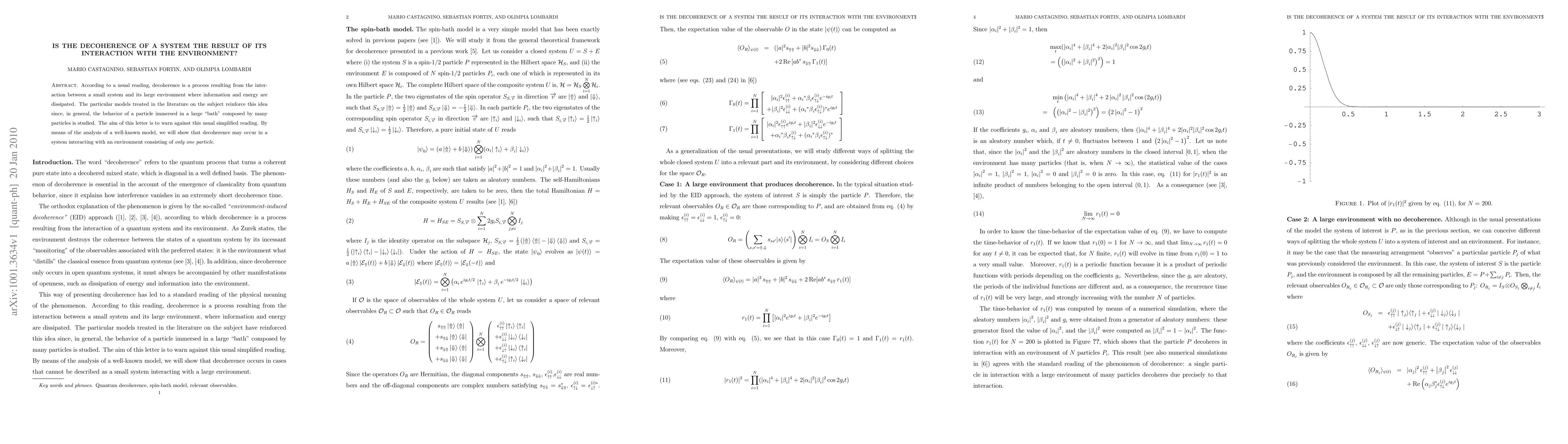 According to a usual reading, decoherence is a process resulting from the interaction between a small system and its large environment where information and energy are dissipated. The particular models treated in the literature on the subject reinforce this idea since, in general, the behavior of a particle immersed in a large "bath" composed by many particles is studied. The aim of this letter is to warn against this usual simplified reading. By means of the analysis of a well-known model, we will show that decoherence may occur in a system interacting with an environment consisting of only one particle.
