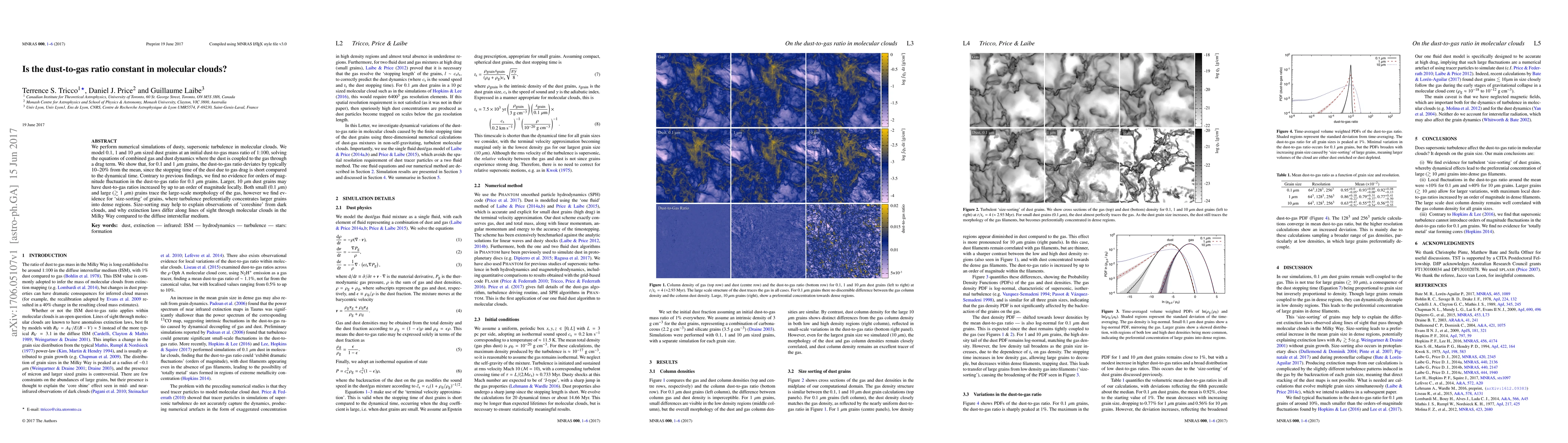 We perform numerical simulations of dusty, supersonic turbulence in molecular clouds. We model 0.1, 1 and 10 {\mu}m sized dust grains at an initial dust-to-gas mass ratio of 1:100, solving the equations of combined gas and dust dynamics where the dust is coupled to the gas through a drag term. We show that, for 0.1 and 1 {\mu}m grains, the dust-to-gas ratio deviates by typically 10-20% from the mean, since the stopping time of the dust due to gas drag is short compared to the dynamical time. Contrary to previous findings, we find no evidence for orders of magnitude fluctuation in the dust-to-gas ratio for 0.1 {\mu}m grains. Larger, 10 {\mu}m dust grains may have dust-to-gas ratios increased by up to an order of magnitude locally. Both small (0.1 {\mu}m) and large ($\gtrsim$ 1 {\mu}m) grains trace the large-scale morphology of the gas, however we find evidence for 'size-sorting' of grains, where turbulence preferentially concentrates larger grains into dense regions. Size-sorting may help to explain observations of 'coreshine' from dark clouds, and why extinction laws differ along lines of sight through molecular clouds in the Milky Way compared to the diffuse interstellar medium.