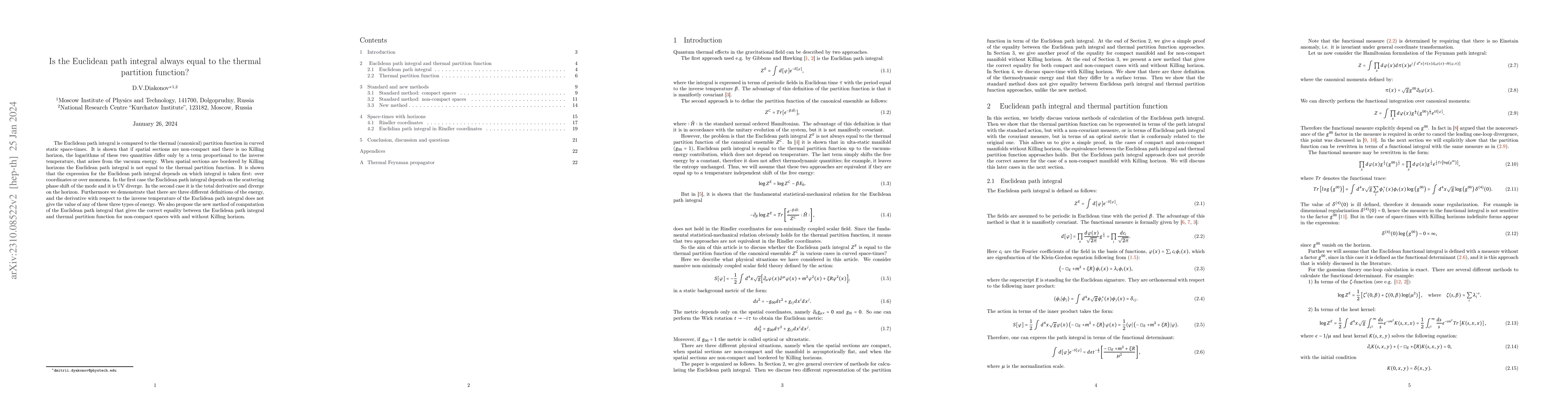 The paper investigates the equivalence between the Euclidean path integral and the thermal partition function in curved space-times, finding that they differ in the presence of Killing horizons. A new computational method is proposed to correctly relate these quantities in non-compact spaces.