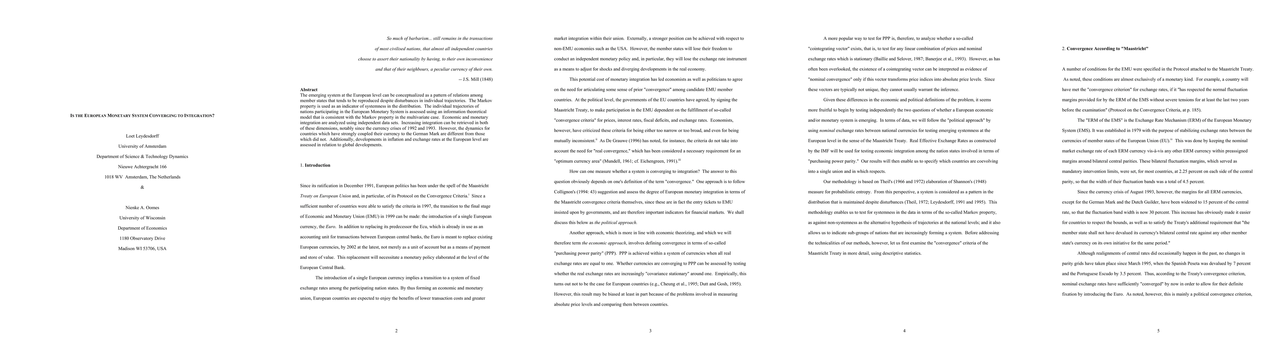 This paper examines the European Monetary System's convergence towards integration using an information theoretical model and Markov property analysis. It finds increasing integration since the 1992 currency crises, with notable differences between countries tightly coupled to the German Mark and those that are not.