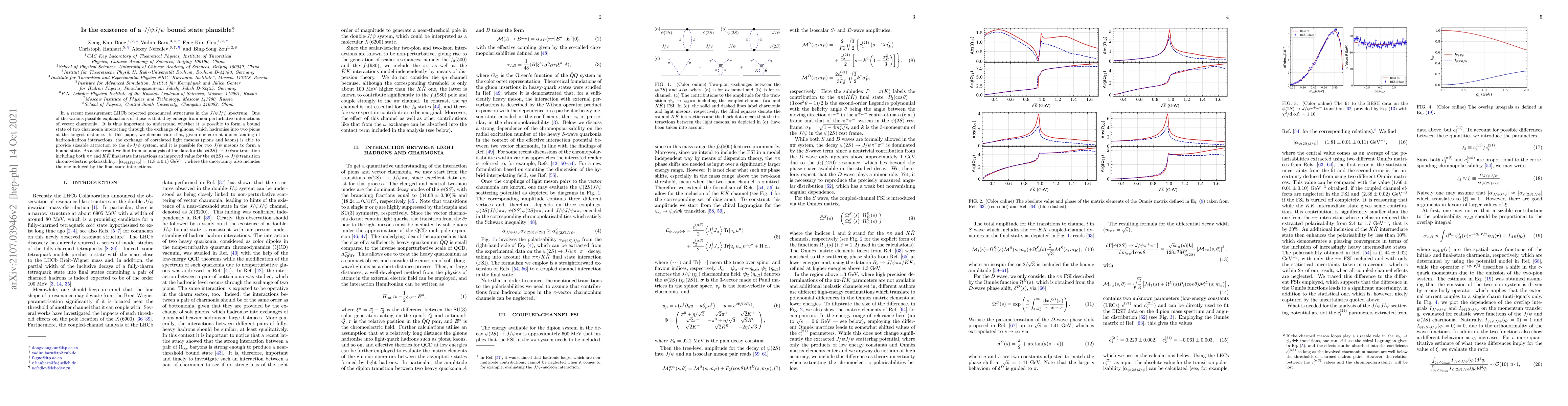 In a recent measurement LHCb reported pronounced structures in the $J/\psi J/\psi$ spectrum. One of the various possible explanations of those is that they emerge from non-perturbative interactions of vector charmonia. It is thus important to understand whether it is possible to form a bound state of two charmonia interacting through the exchange of gluons, which hadronise into two pions at the longest distance. In this paper, we demonstrate that, given our current understanding of hadron-hadron interactions, the exchange of correlated light mesons (pions and kaons) is able to provide sizeable attraction to the di-$J/\psi$ system, and it is possible for two $J/\psi$ mesons to form a bound state. As a side result we find from an analysis of the data for the $\psi(2S)\to J/\psi \pi\pi$ transition including both $\pi\pi$ and $K\bar K$ final state interactions an improved value for the $\psi(2S)\to J/\psi$ transition chromo-electric polarisability: $|\alpha_{\psi(2S)J/\psi}|= (1.8\pm 0.1)~\mbox{GeV}^{-3}$, where the uncertainty also includes the one induced by the final state interactions.
