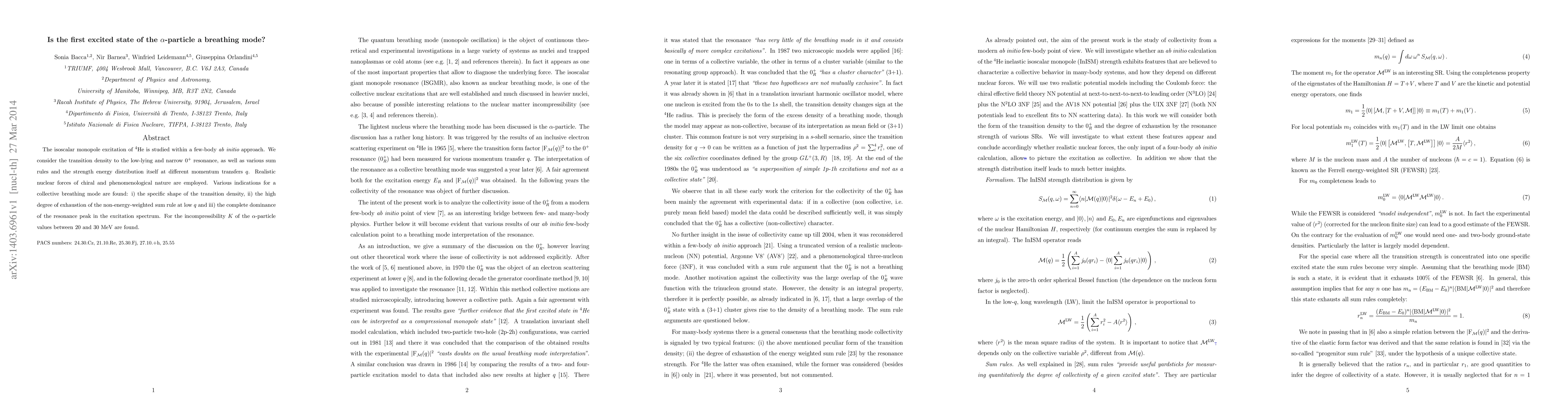 The isoscalar monopole excitation of 4He is studied within a few-body ab initio approach. We consider the transition density to the low-lying and narrow 0+ resonance, as well as various sum rules and the strength energy distribution itself at different momentum transfers q. Realistic nuclear forces of chiral and phenomenological nature are employed. Various indications for a collective breathing mode are found: i) the specific shape of the transition density, ii) the high degree of exhaustion of the non-energy-weighted sum rule at low q and iii) the complete dominance of the resonance peak in the excitation spectrum. For the incompressibility K of the alpha-particle values between 20 and 30 MeV are found.
