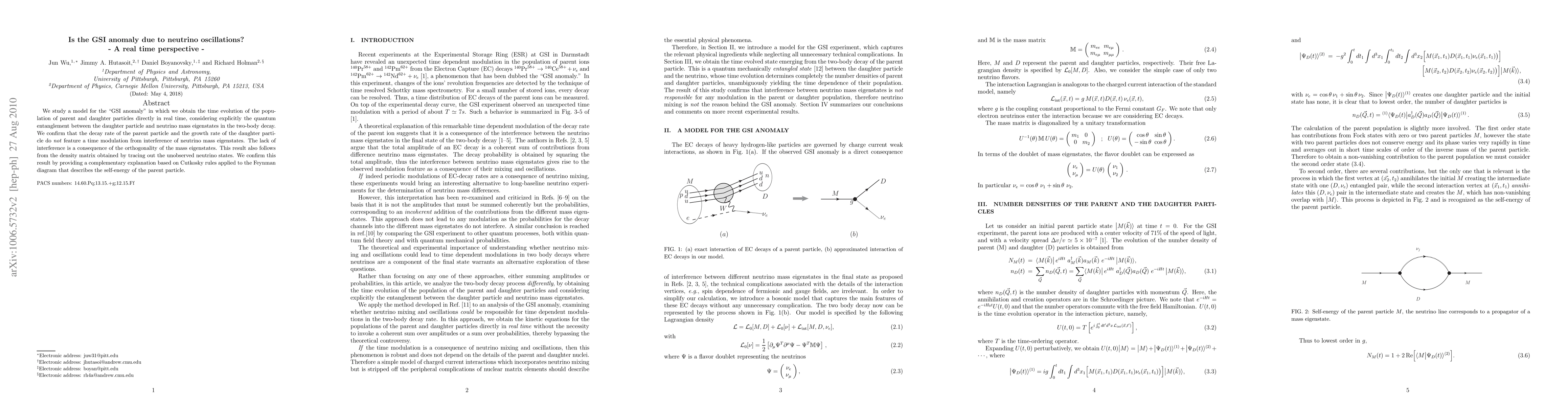 We study a model for the "GSI anomaly" in which we obtain the time evolution of the population of parent and daughter particles directly in real time, considering explicitly the quantum entanglement between the daughter particle and neutrino mass eigenstates in the two-body decay. We confirm that the decay rate of the parent particle and the growth rate of the daughter particle do \emph{not} feature a time modulation from interference of neutrino mass eigenstates. The lack of interference is a consequence of the orthogonality of the mass eigenstates. This result also follows from the density matrix obtained by tracing out the unobserved neutrino states. We confirm this result by providing a complementary explanation based on Cutkosky rules applied to the Feynman diagram that describes the self-energy of the parent particle.