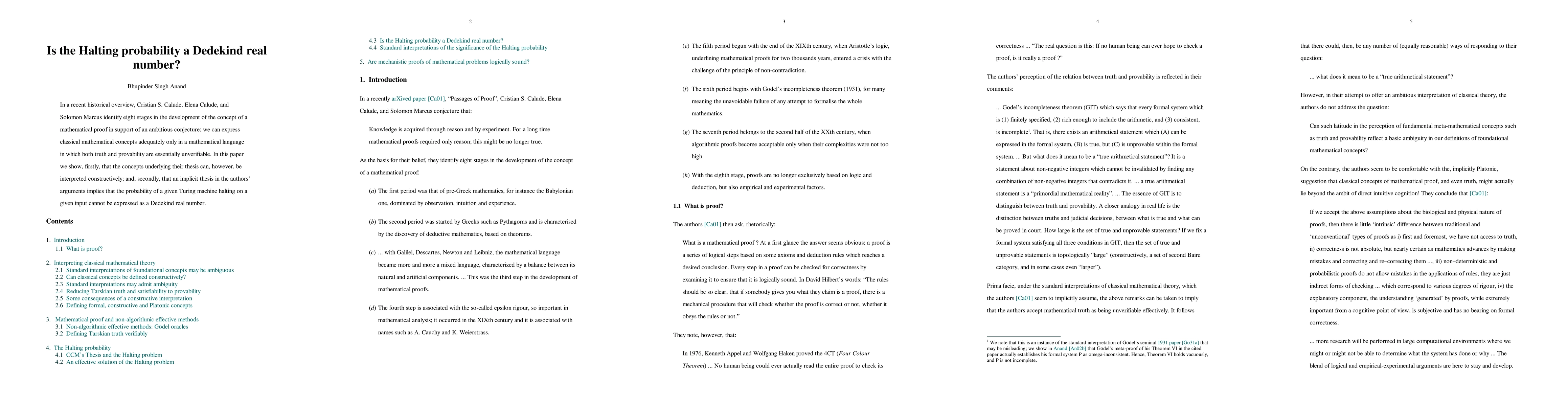 In a recent historical overview, Cristian S. Calude, Elena Calude, and Solomon Marcus identify eight stages in the development of the concept of a mathematical proof in support of an ambitious conjecture: we can express classical mathematical concepts adequately only in a mathematical language in which both truth and provability are essentially unverifiable. In this paper we show, firstly, that the concepts underlying their thesis can, however, be interpreted constructively; and, secondly, that an implicit thesis in the authors' arguments implies that the probability of a given Turing machine halting on a given input cannot be expressed as a Dedekind real number.