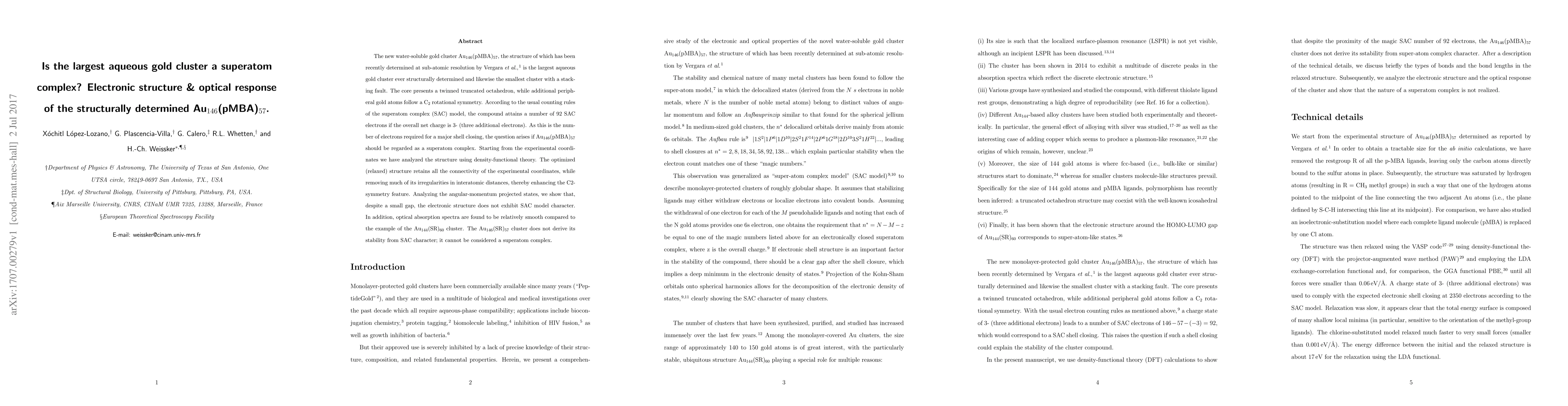 The new water-soluble gold cluster Au146(pMBA)57, the structure of which has been recently determined at sub-atomic resolution by Vergara et al. [1], is the largest aqueous gold cluster ever structurally determined and likewise the smallest cluster with a stacking fault. The core presents a twinned truncated octahedron, while additional peripheral gold atoms follow a C2 rotational symmetry. According to the usual counting rules of the superatom complex (SAC) model, the compound attains a number of 92 SAC electrons if the overall net charge is 3- (three additional electrons). As this is the number of electrons required for a major shell closing, the question arises if Au146(pMBA)57 should be regarded as a superatom complex. Starting from the experimental coordinates we have analyzed the structure using density-functional theory. The optimized (relaxed) structure retains all the connectivity of the experimental coordinates, while removing much of its irregularities in interatomic distances, thereby enhancing the C2-symmetry feature. Analyzing the angular-momentum projected states, we show that, despite a small gap, the electronic structure does not exhibit SAC model character. In addition, optical absorption spectra are found to be relatively smooth compared to the example of the Au144(SR)60 cluster. The Au146(SR)57 cluster does not derive its stability from SAC character; it cannot be considered a superatom complex.